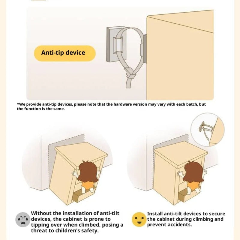 تم تجهيز الخزانة بفتحات تهوية لتدفق الهواء وجهاز مضاد للانقلاب، وهو ضروري لضمان السلامة أثناء اللعب والتخزين. يُحث الآباء على تركيب هذه الأجهزة لتأمين الخزانة، لحمايتها من مخاطر الانقلاب عندما يتسلق الأطفال الصغار. بالإضافة إلى ذلك، فإن تشطيب الزيت الشمعي النباتي صديق للبيئة، غير سام، ويحمي الخشب مع الحفاظ على نسيج جذاب.