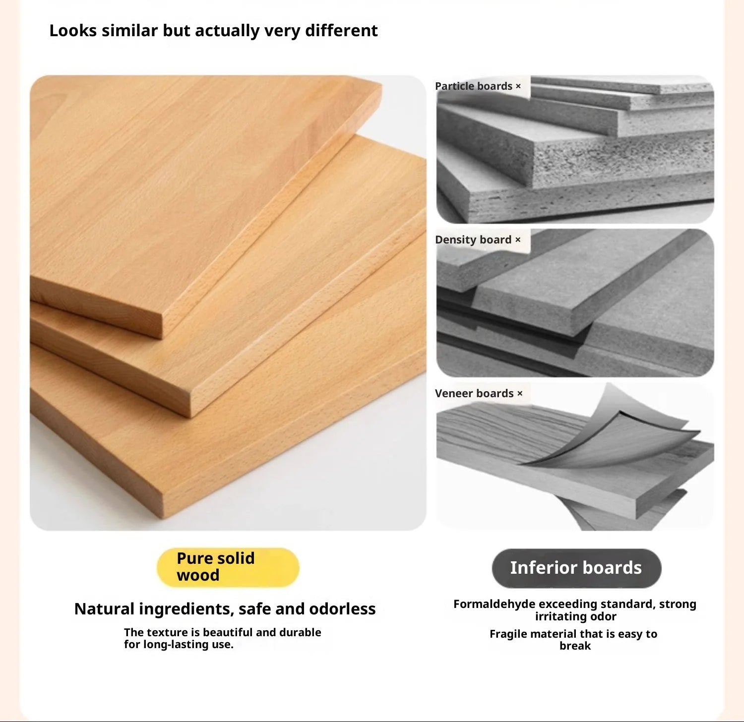 • خشب الصنوبر النيوزيلندي: يستخدم للوحة العلوية والسفلية، الألواح الأساسية، الفواصل، إطارات اللوحة الخلفية، وأساسات قضبان الملابس. يزن خفيفًا، مستقرًا، ويتميز بمتانة جيدة مع حبوب مستقيمة وقلّة العقد.