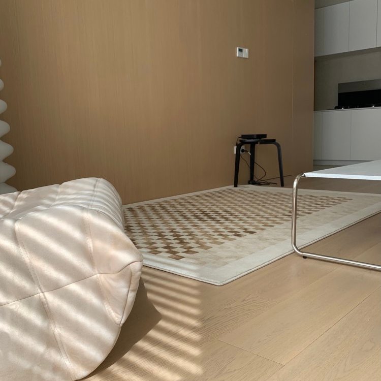 Apart from the bathroom and kitchen, I've laid wooden flooring throughout the rest of my home. This uniformity in flooring helps to create a cohesive and expansive feel across different areas.