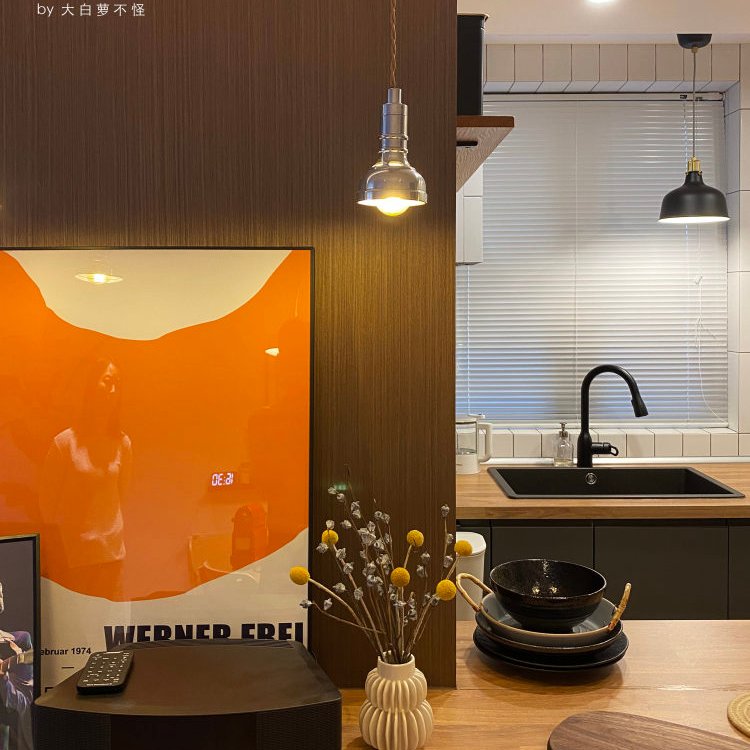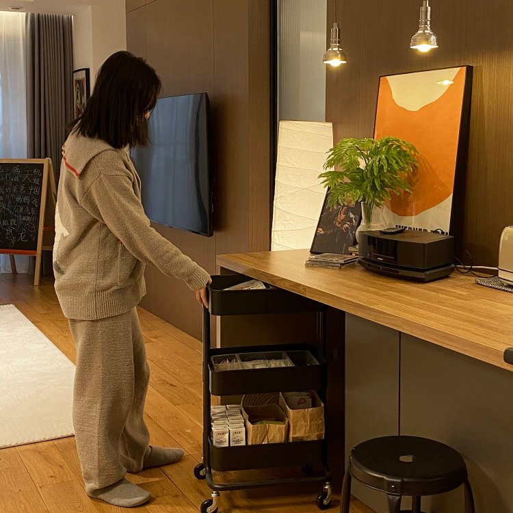 Facing the dining area, part of the island's cabinetry doubles as storage for the dining room. We also reserved space for a small trolley, functioning as a movable sideboard. Our personal touch includes a CD player on the island, our favorite music, and decorative paintings, creating a cozy spot for enjoying snacks, afternoon tea, and music.