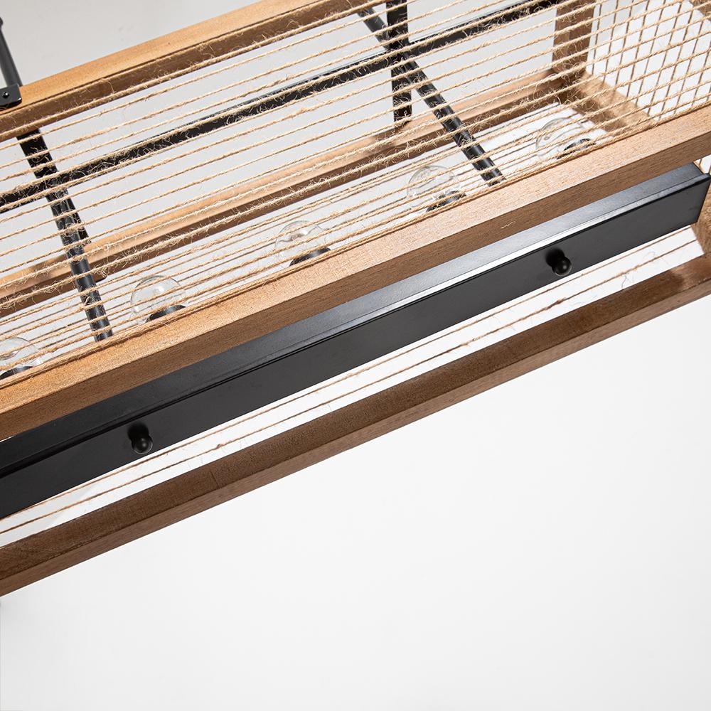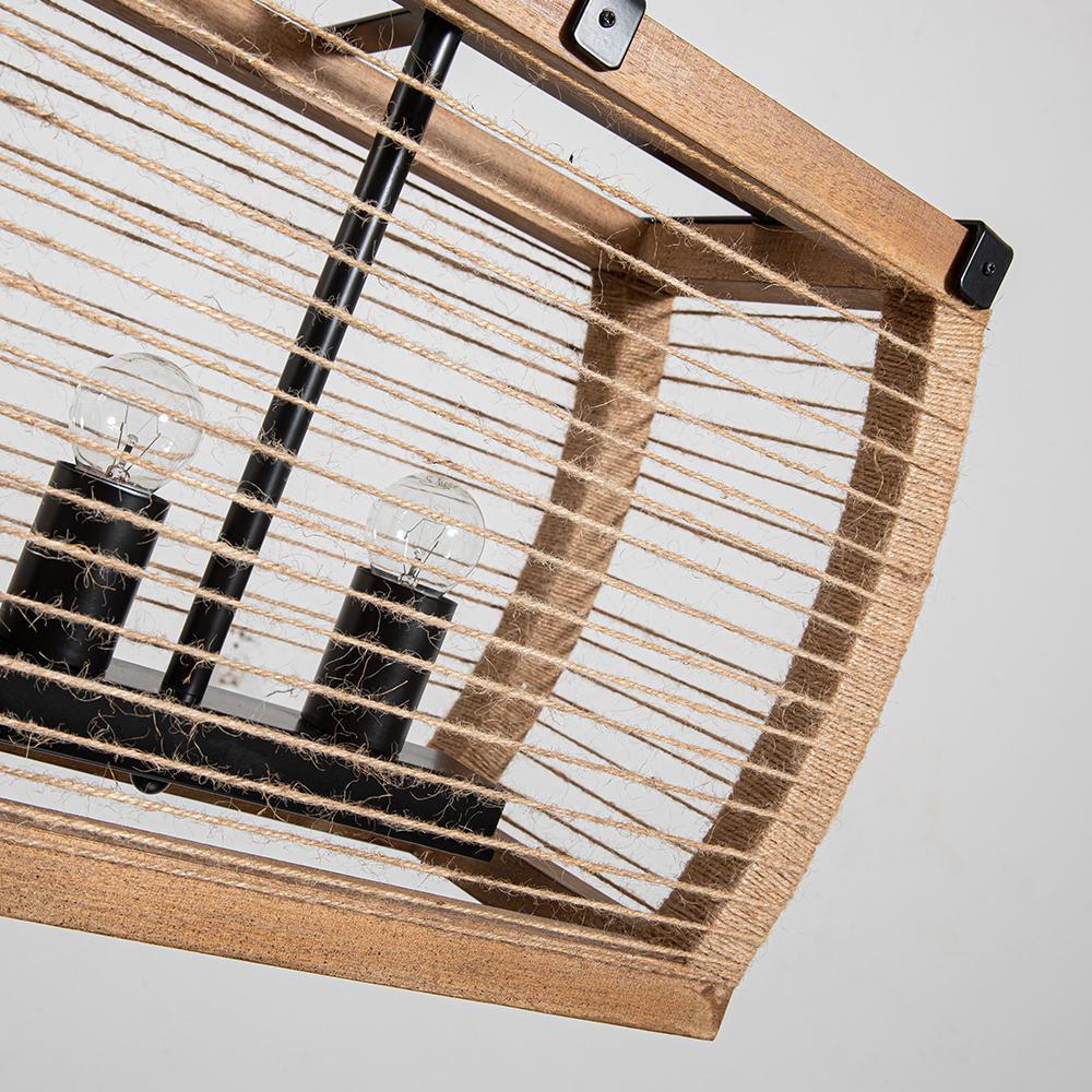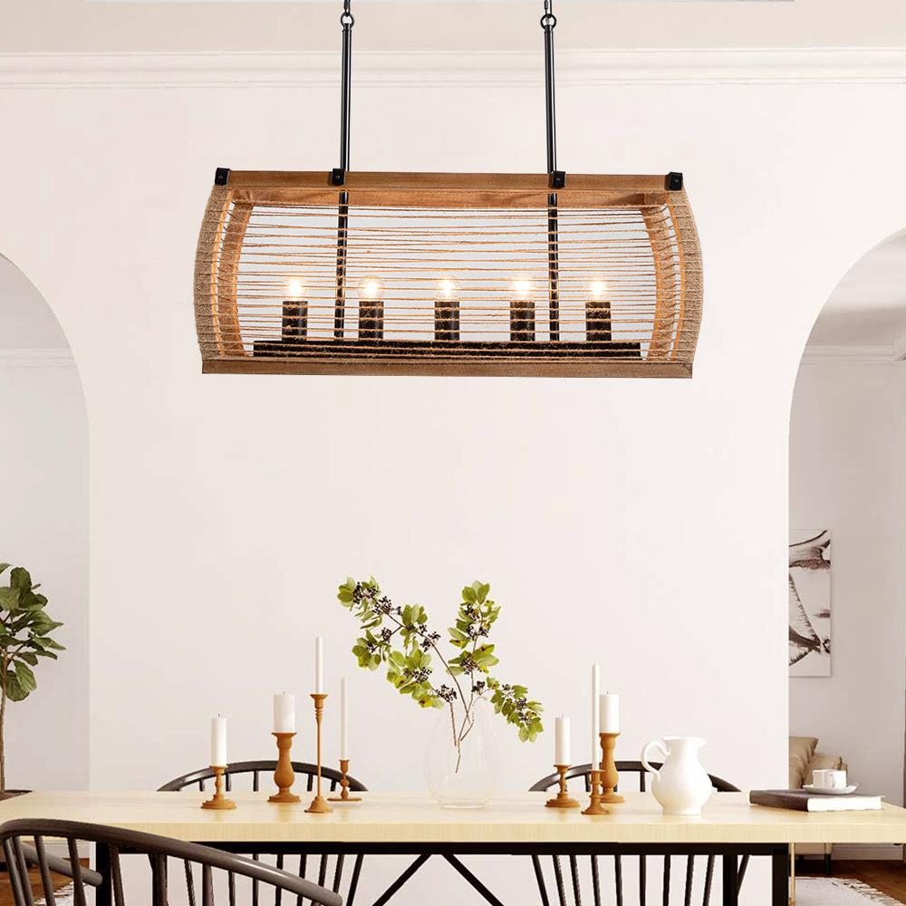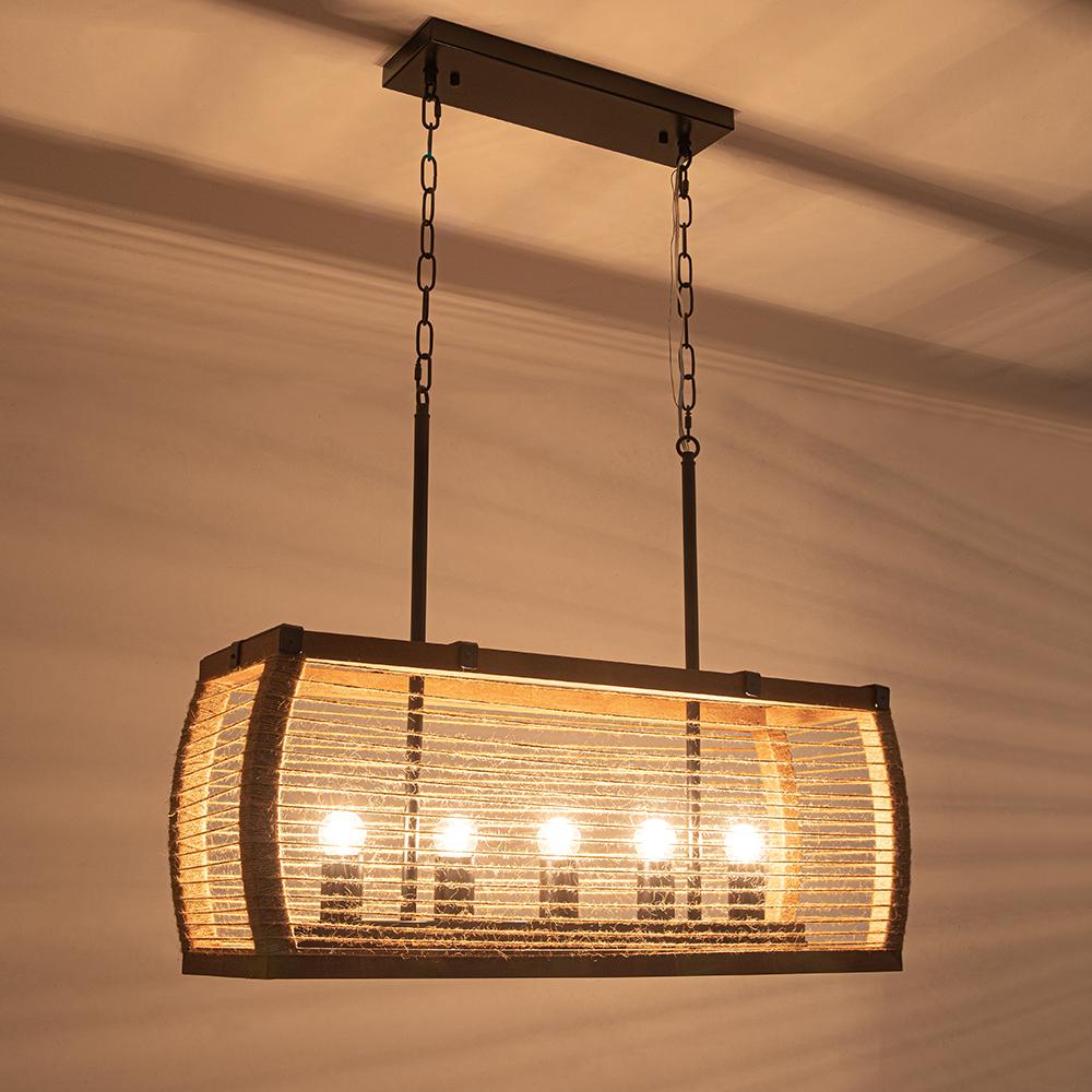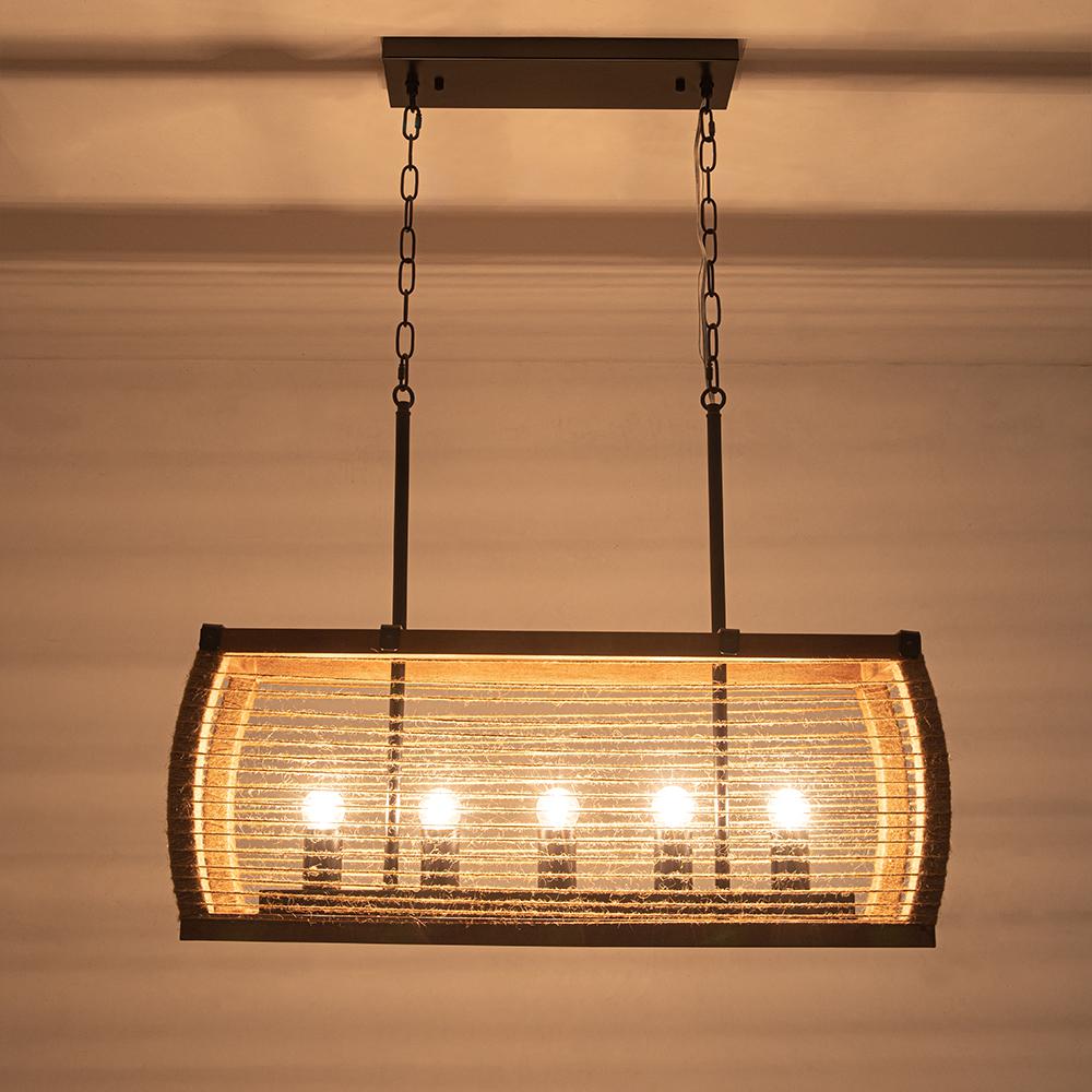 Rustic 5-Light Kitchen Island Linear Rectangle Pendant Light Wood Washed & Jute Rope