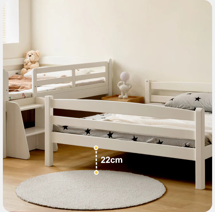 This bunk bed features a practical design that allows the upper and lower beds to be detached, transforming the bunk bed into two separate beds to enhance flexibility. A safety ramp with an optional small step ladder (available for separate purchase) ensures easy access, allowing your children to climb safely. The escalator can be installed on either side, accommodating any room layout without restrictions.