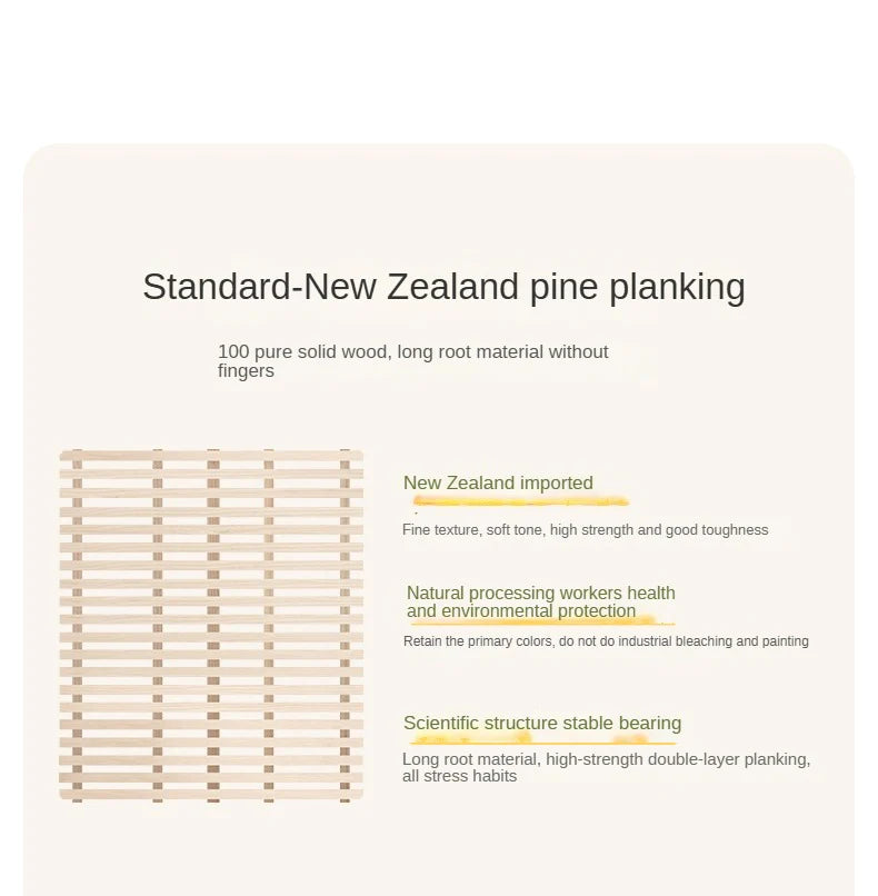 3. Pine wood imported from New Zealand (used for decking, decking supports, middle poles, bedside crossbars, and bedside partitions) has good toughness, stable properties, light texture, and straight texture with few knots.