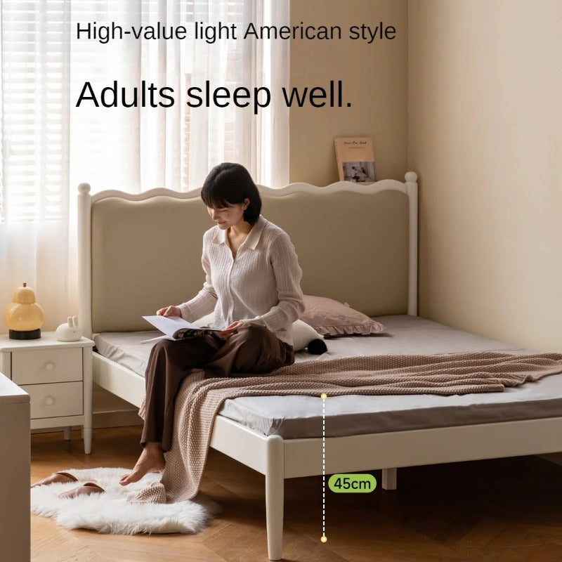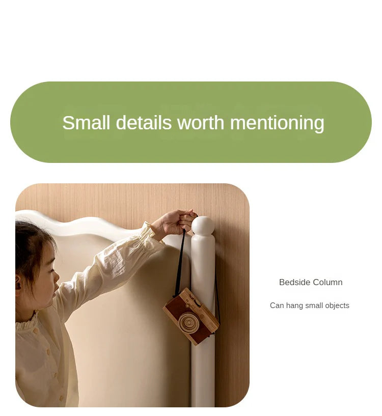 This bed showcases a romantic American Rococo style, characterized by a wave streamline and vintage color matching that creates an atmospheric and beautiful look. The headboard is perfectly designed to accommodate various mattress thicknesses, whether it's 8cm, 15cm, or even 22cm, allowing you to choose based on your child's comfort preferences.