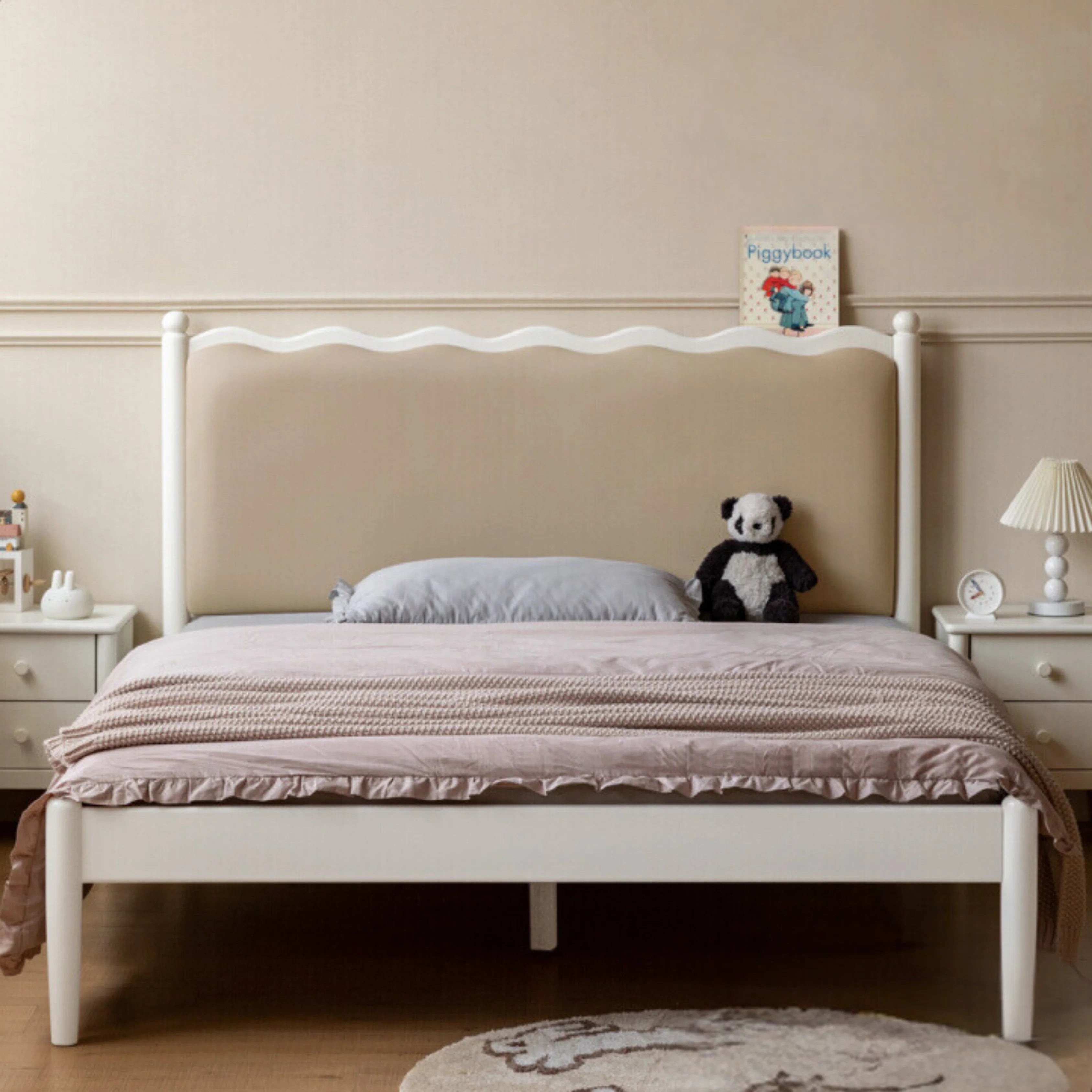 Milk White color Rubber Wood Children's bed (Milk Tea Organic Leather)