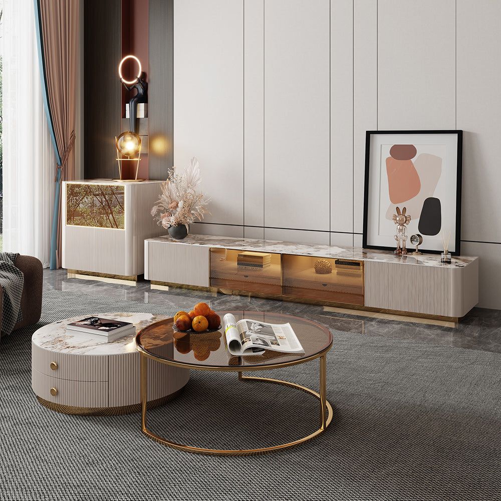 Modern Round Coffee Table Set with Sintered Stone Top, 2 Drawers & Gold Metal Legs