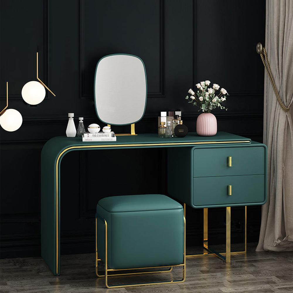 Modern 2-Drawer Wood Makeup Vanity Set with Mirror & Stool X Base Stainless Steel in Gold
