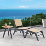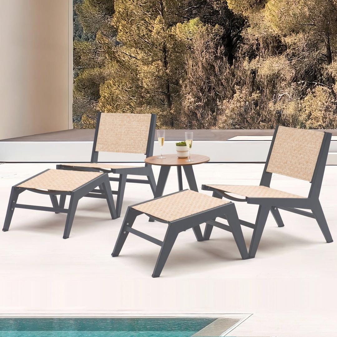 Experience the ultimate in outdoor relaxation with this set of high-quality aluminum alloy outdoor lounge chairs. With a rustic rattan design, this 5 piece set includes 2 lounge chairs, 2 footstools, and a round coffee table. Crafted from only the finest materials, this set is built to last and provide you with the utmost comfort during your outdoor leisure time. The aluminum alloy frame ensures a sturdy construction, while the rattan design elements add a touch of rustic charm that is perfect for any patio or outdoor space.