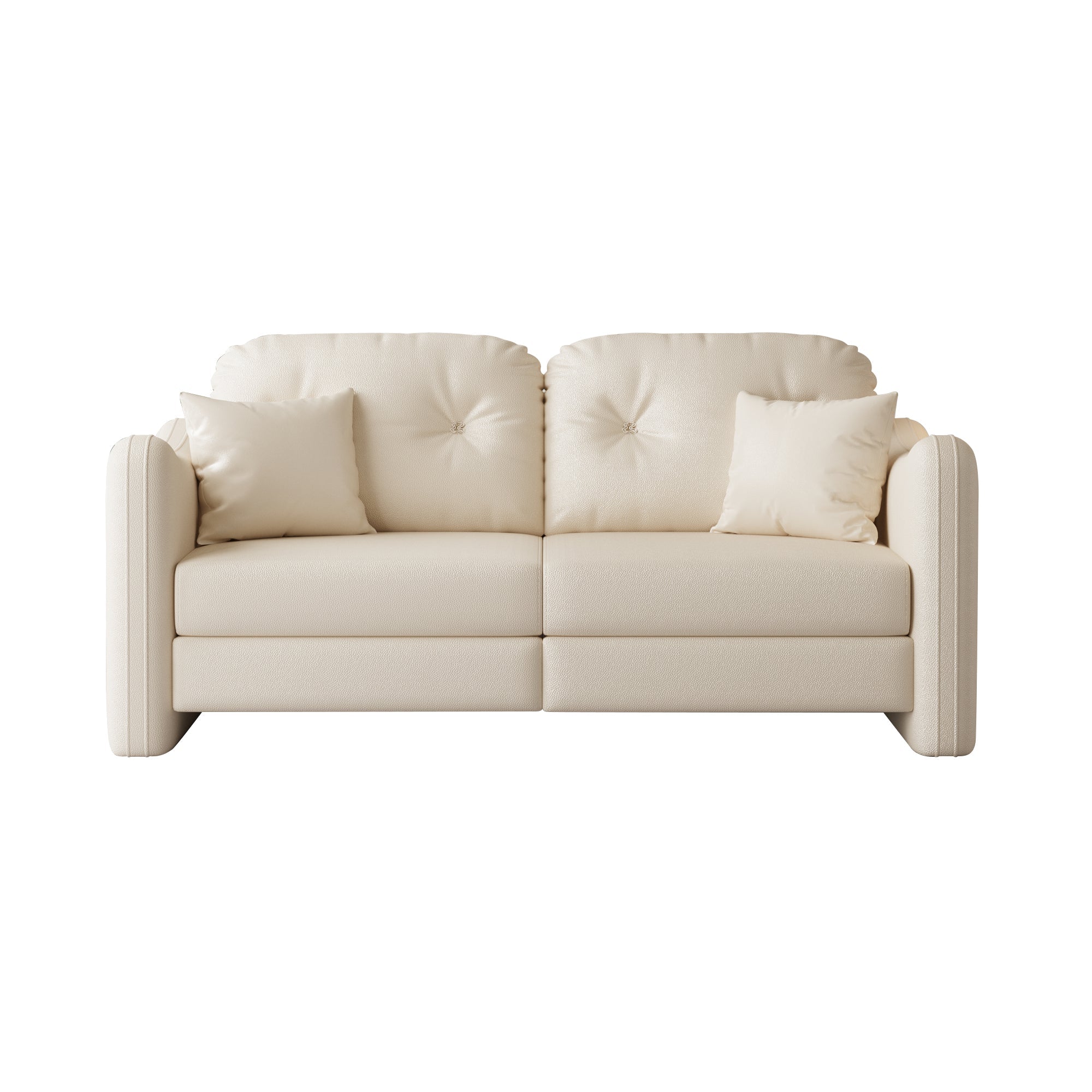 Designed with small spaces in mind, this sofa is compact yet capable of seating up to three people comfortably, making it an ideal choice for apartments, bedrooms, or waiting rooms. The chic button-pull point design on the backrest enhances its modern aesthetic, and the accompanying two large back cushions and two matching pillows escalate the comfort level.