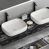 - Includes two ceramic vessel sinks, a marble top and three full-extension, recessed drawers with soft-close hardware.