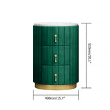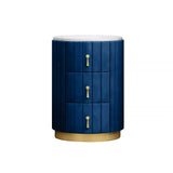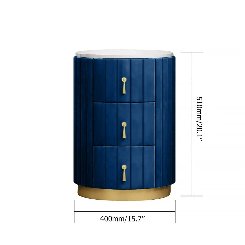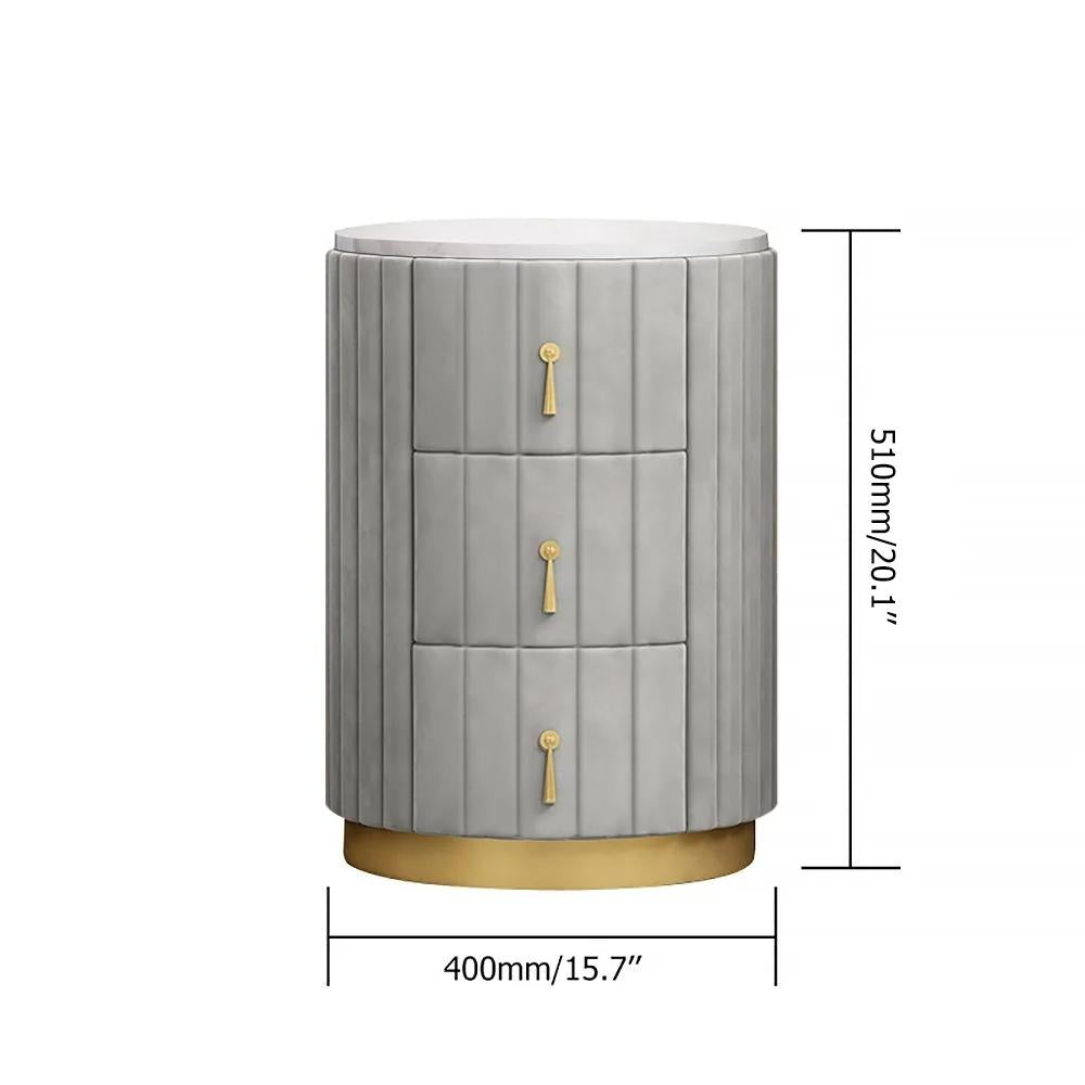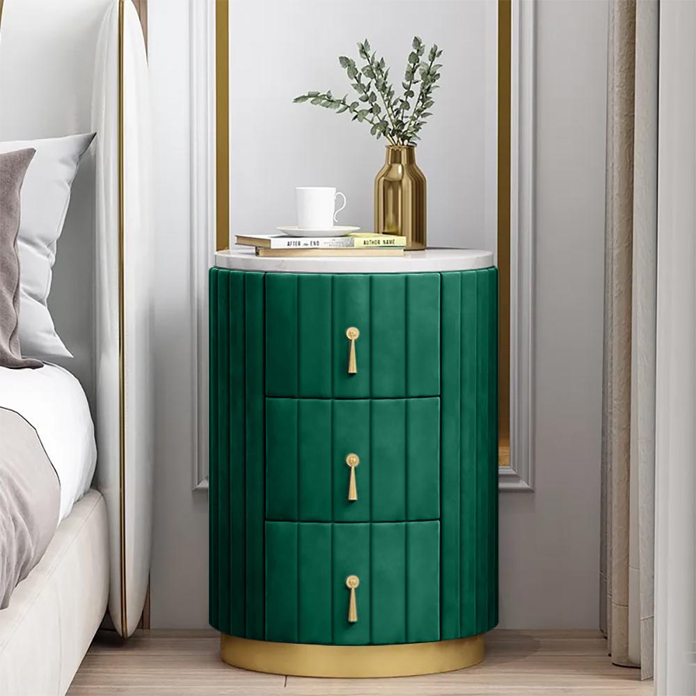 This lovely round nightstand has a minimalistic contemporary style that is eye-catching and functional. The design of a faux marble top, velvet upholstery, and 3 storage drawers make this modern nightstand can together form and function beautifully. Accentuate the living area with this fashionable drawer nightstand, and take pleasure in the adaptability and beauty it brings to your house area. It's perfect for compact or corner places since it can be tucked neatly into a corner or next to a chair or bed or sofa side while still providing a display area and additional storage.