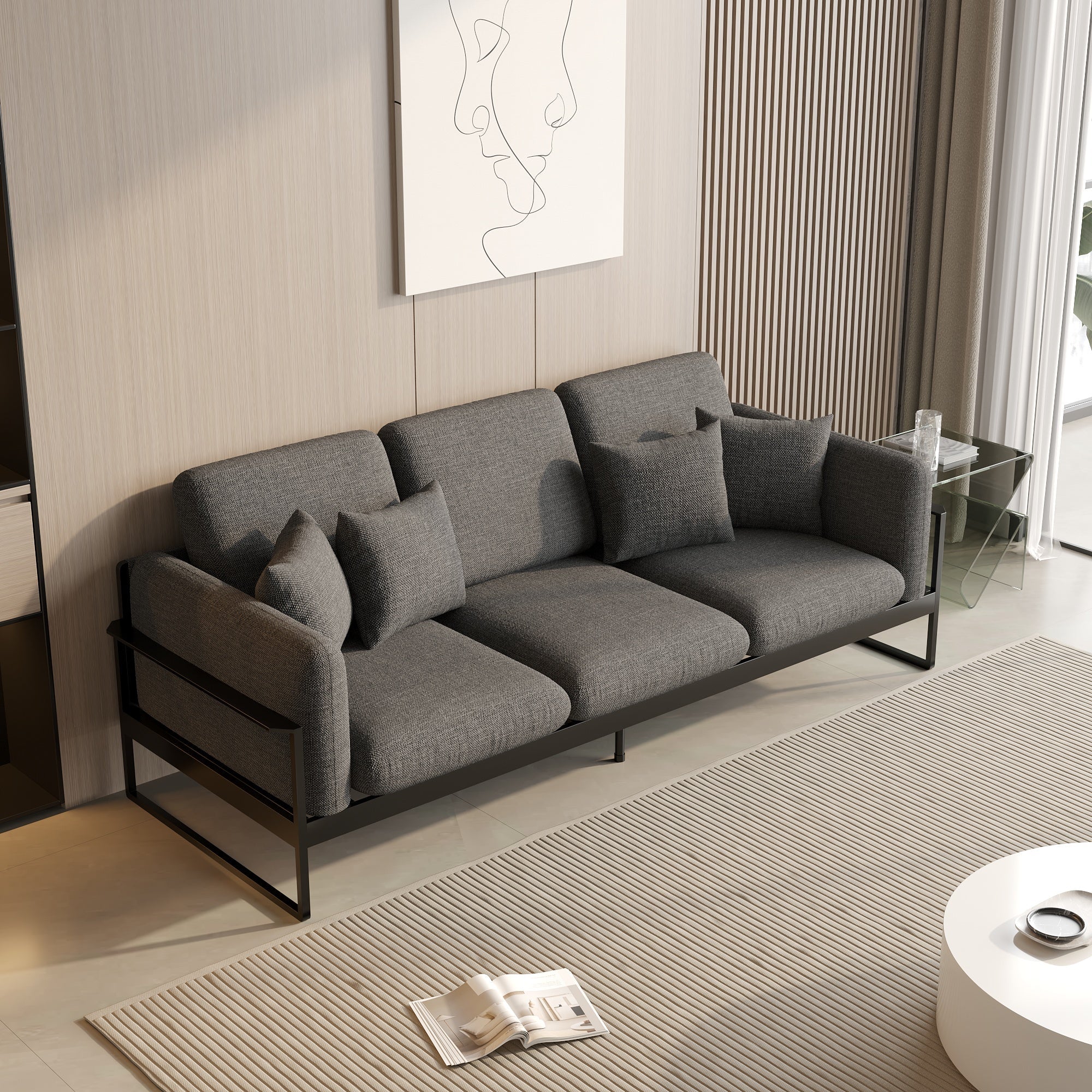 This sofa boasts a sleek, minimalist design complemented by fluid lines that effortlessly adorn any living area. Wrapped in a soft cotton and linen fabric, it promises a delicate touch and resistance to pilling, ensuring it remains a centerpiece in your home for years. The gray color introduces a neutral palette that easily integrates into various interior designs, enhancing existing decor.