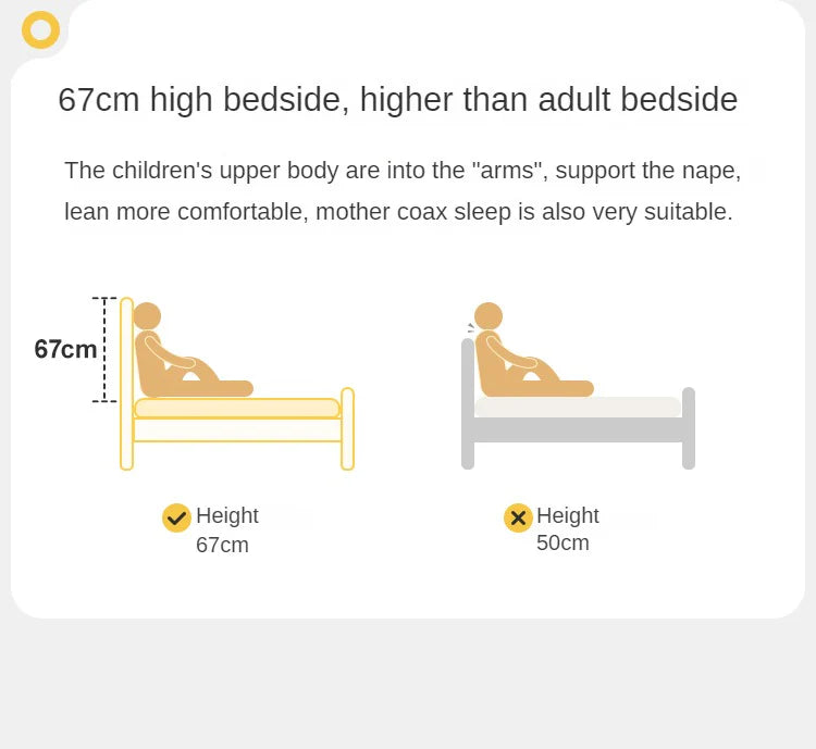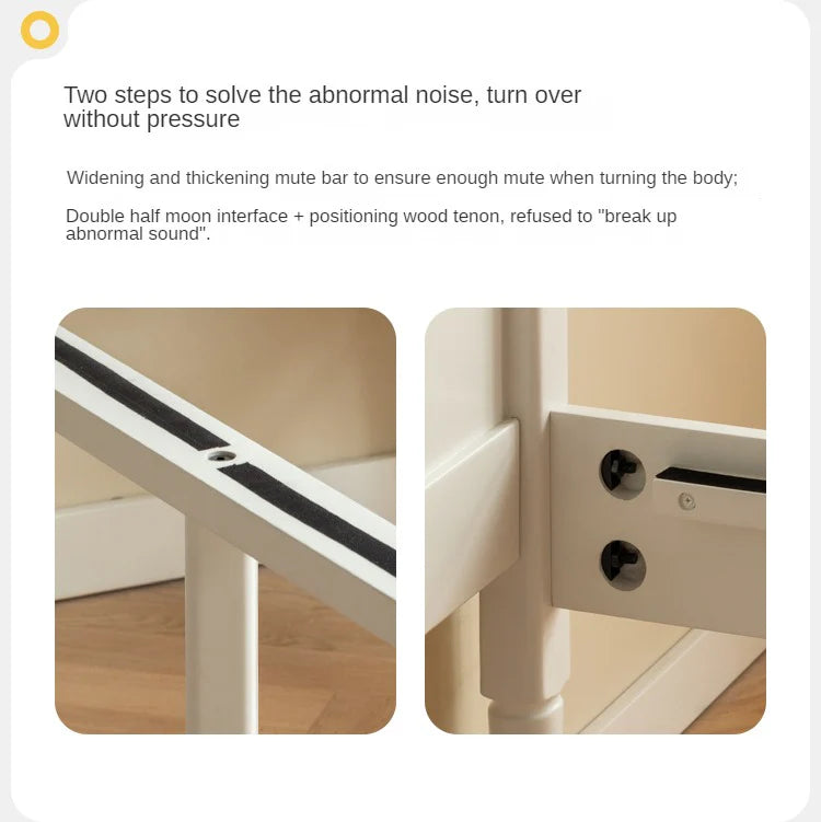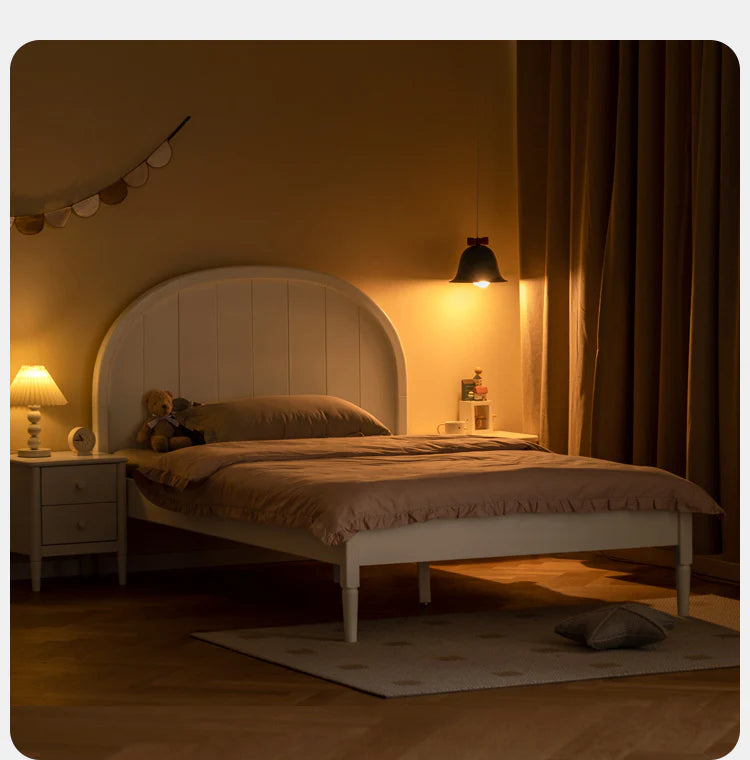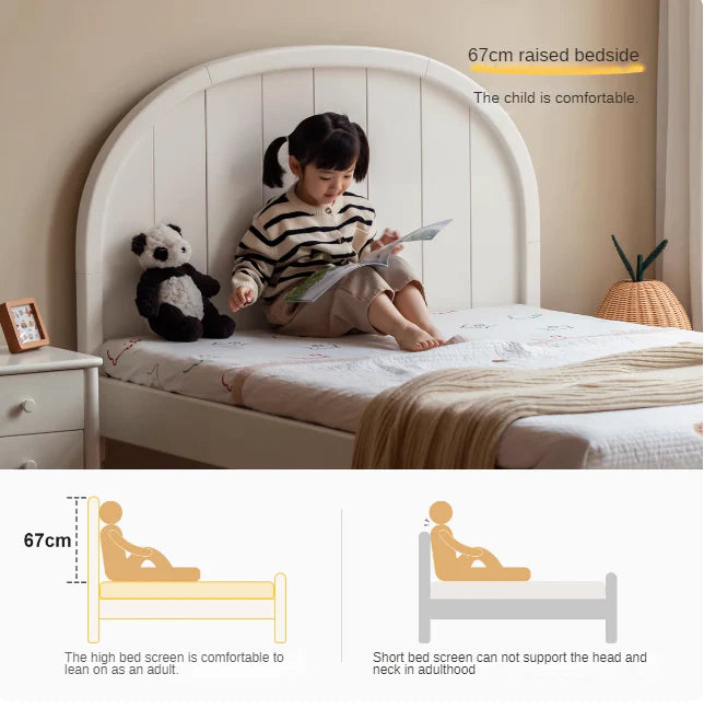 A stable and durable & dexterous children's bed, milky white, gentle and bright.The elegant arc-shaped high bedside table is gentle and cute to create a dreamy girl bed.The tall round solid wood legs are stable and powerful, and the child can sleep alone with peace of mind, more gentle than the moon