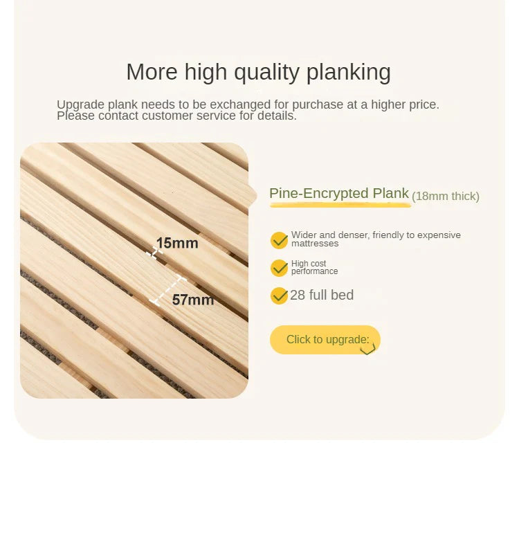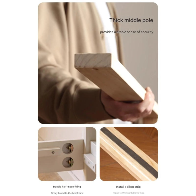 The bed is made primarily from Thailand imported rubber wood, known for its durability and resistance to deformation. The finger joint process ensures uniform stress distribution, preventing cracking or warping over time. Complemented by high-quality New Zealand pine, the bed's structure includes: