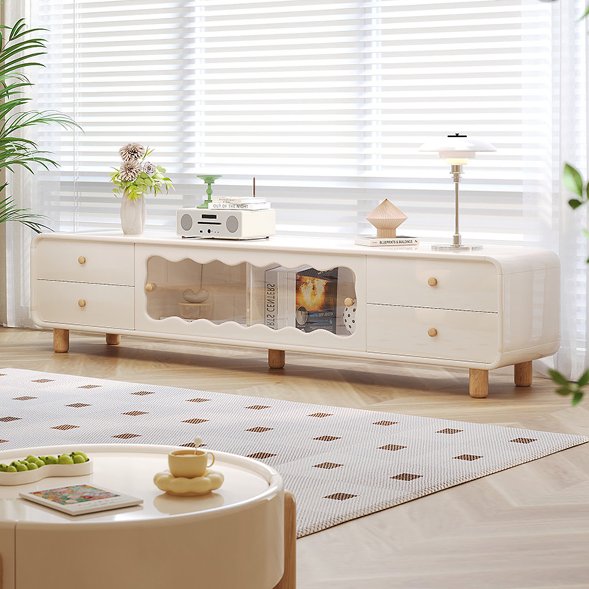 Enhance your entertainment area with this luxurious and functional Modern Cream Wooden TV Stand. Crafted from premium medium density fiberboard (MDF) and finished in a charming beige tone, this TV stand is not just furniture but a statement piece. The sliding door and four spacious drawers provide ample storage, helping you maintain an uncluttered living space. With dimensions of 78.7'' W X 15.7'' D X 18.9'' H, it is perfect for large screen TVs and accompanying accessories.