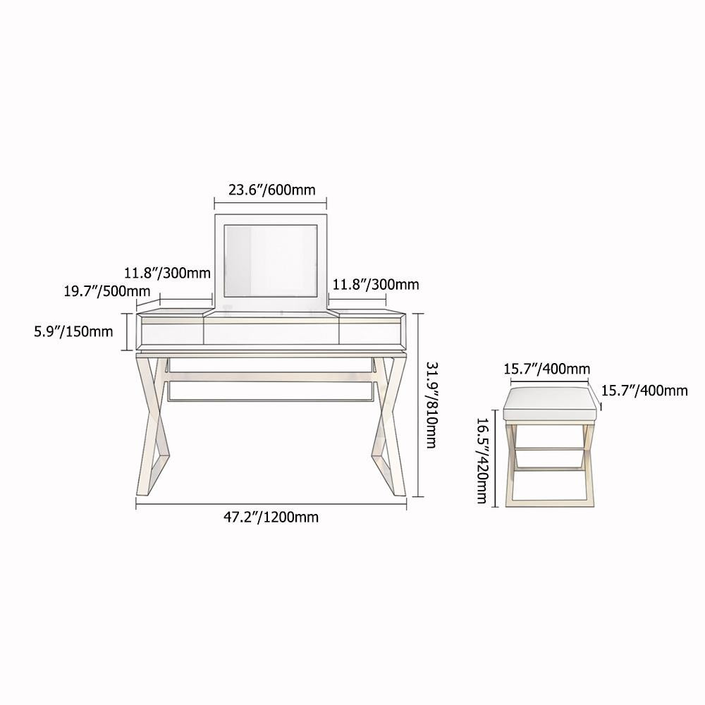 Modern 2-Drawer Wood Makeup Vanity Set with Mirror & Stool X Base Stainless Steel in Gold