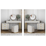 Accented with tasteful gold stainless steel stripes in an off-white tone, this makeup vanity lends a glamorous flair that blends well with any modern decor. Featuring the side cabinet, the 2-velvet drawer vanity table offers ample storage rooms for your articles of daily use. Matched with a PU leather upholstery seat and a round mirror, it is sure to bring you a pleasant dressing experience. Boasting great materials, it allows long-lasting service and timeless sophistication. Get it now!