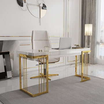 63" Modern Office Desk with Drawer Writing Desk with Abstract Design in White & Gold