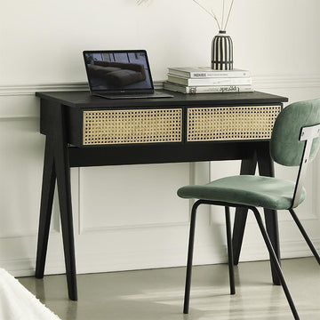 Modern Black Rattan Desk Home Office Desk with Drawers Wooden Writing Desk - Black