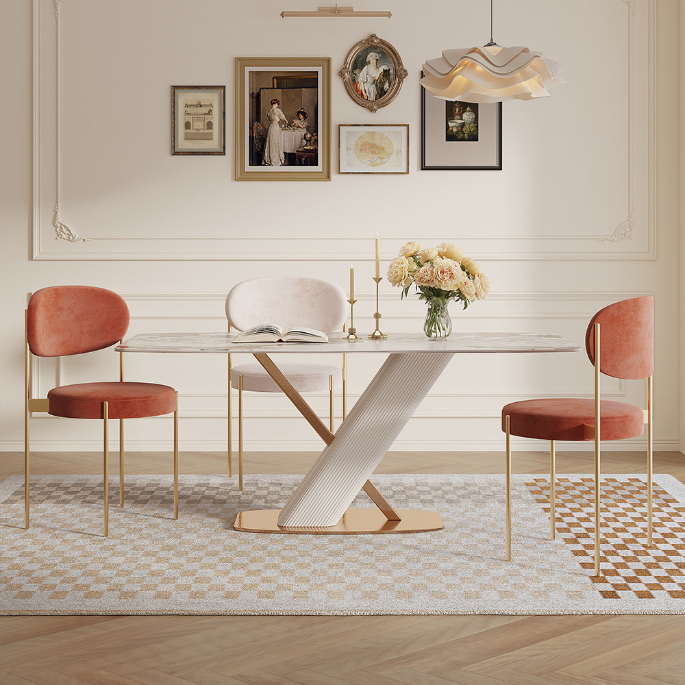Modern White Marble Dining Table with Gold Stainless Steel X-Base