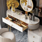 Let this graceful makeup vanity table help you keep your cosmetics and accessories tidy and in order. A drawer of the table is compartmentalized into blocks, which provides you orderly spaces to store your lipsticks, foundation, and beauty tools. Besides, there is a corner cabinet divided into three drawers that offer you ample spaces to store other necessaries. With a premium marble tabletop, it is waterproof and anti-scratch, which is easy to maintain. Moreover, the combo of white and gold finish adds a sense of elegance to your room.