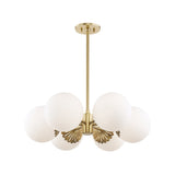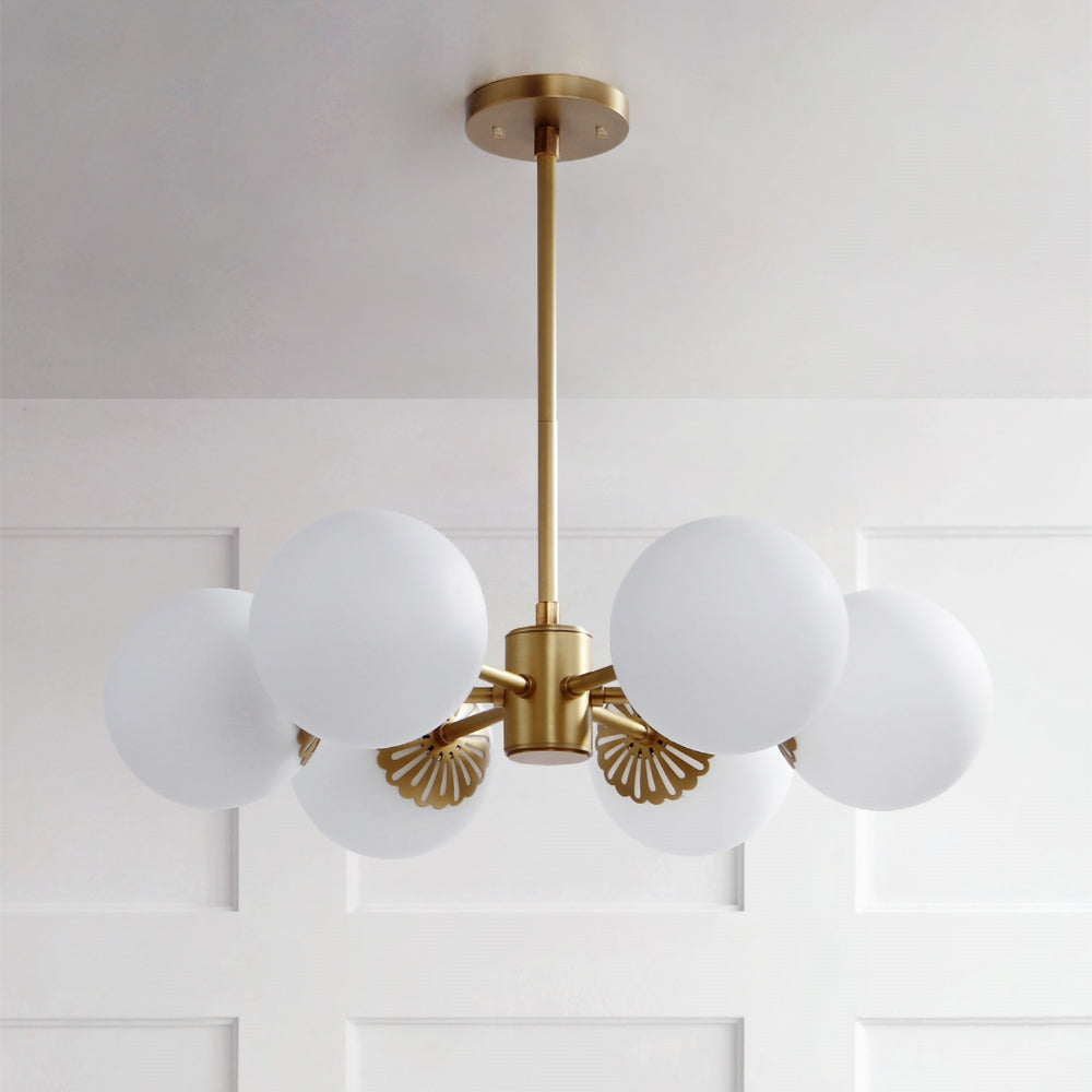 Inspired by mid-century modern style, this 6-light globe chandelier balances form and funtion. Featuring 6 white glass globe, this charming chandelier will illuminate your home with a modern flair. 6-llight design provides abundant light to any room, while adding a welcoming, warm ambiance. Cinstructed from white glass and metal in gold, this lighting is perfect for a transitional, cottage-style or mid-century home. Perfect for your living room, kitchen, dining room, and more.
