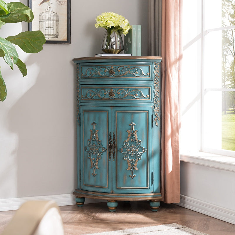 Antique Triangle Wood Accent Cabinet with 2 Doors & 2 Drawers in Blue