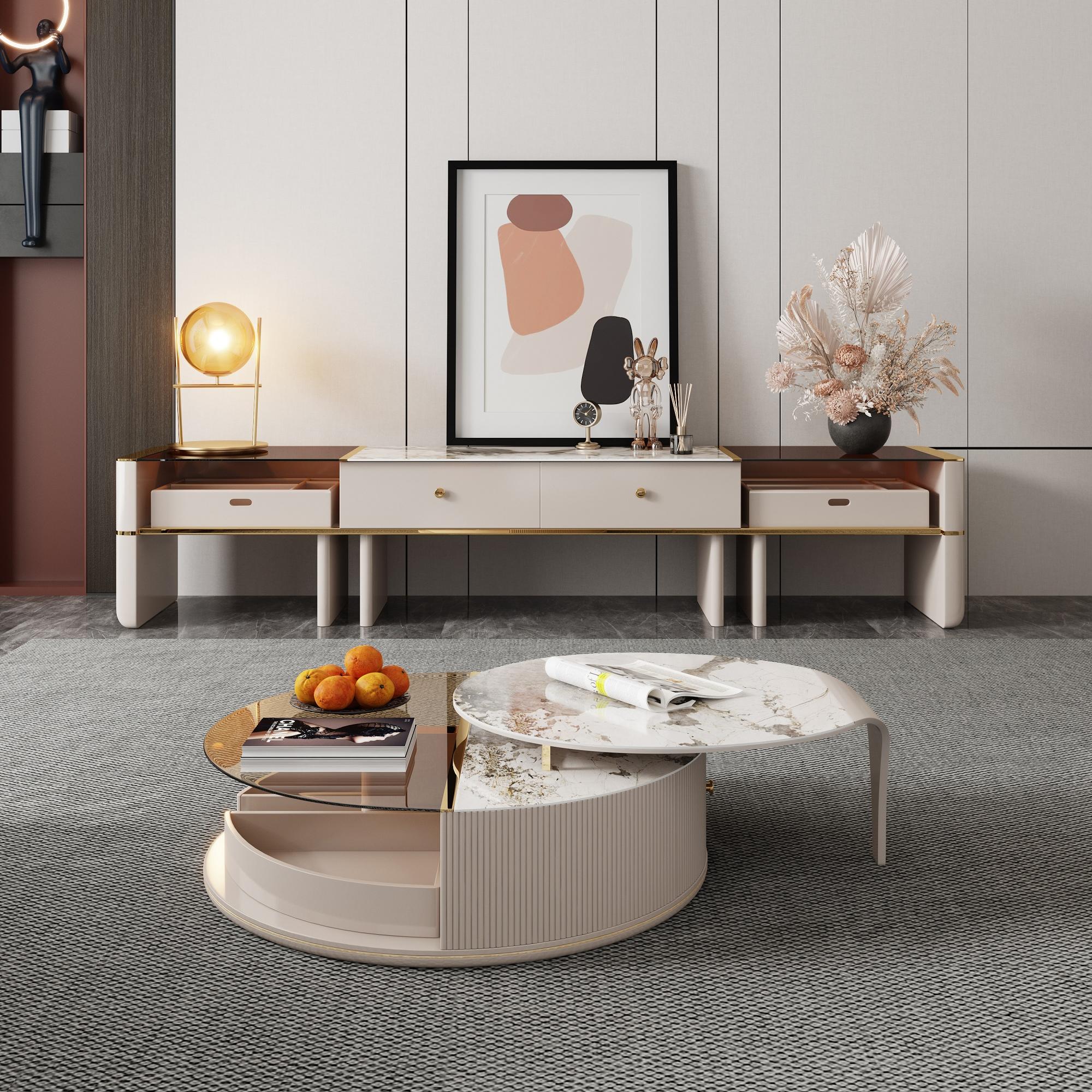 Introducing the pinnacle of modern elegance and practicality, our Round Coffee Table Set in a sophisticated beige hue is meticulously designed to complement any living space. Crafted from durable and high-quality materials such as sintered stone and high-density protection board, this table set is not only visually appealing but also extremely functional. The main table boasts a cleverly incorporated drawer for additional storage, keeping your space tidy and clutter-free.
