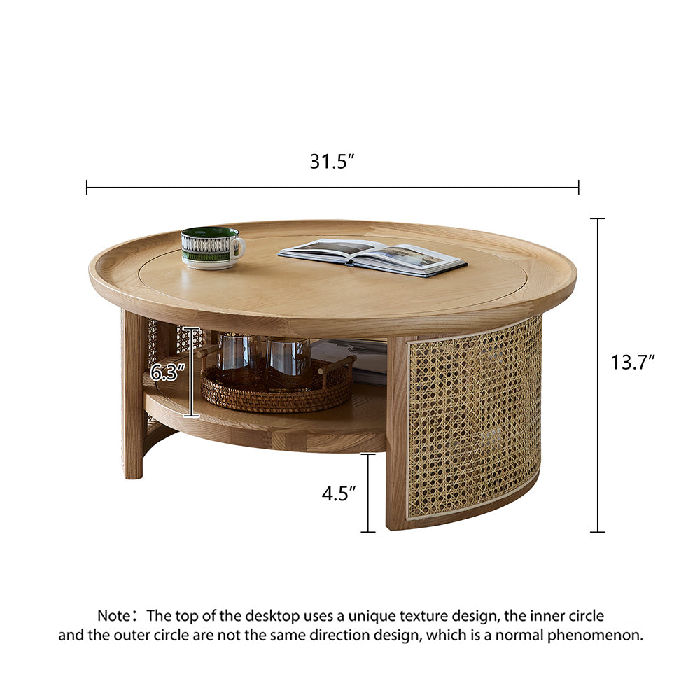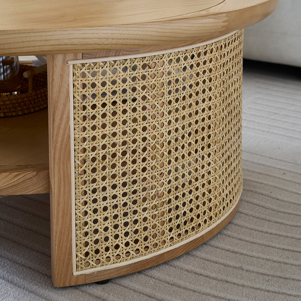 Solid Wood 2-Tiered Japandi Round Coffee Table with Rattan Base