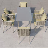 7-Pieces Rope Woven Outdoor Dining Set with Glass-top Rectangle Table and 6 Armchairs