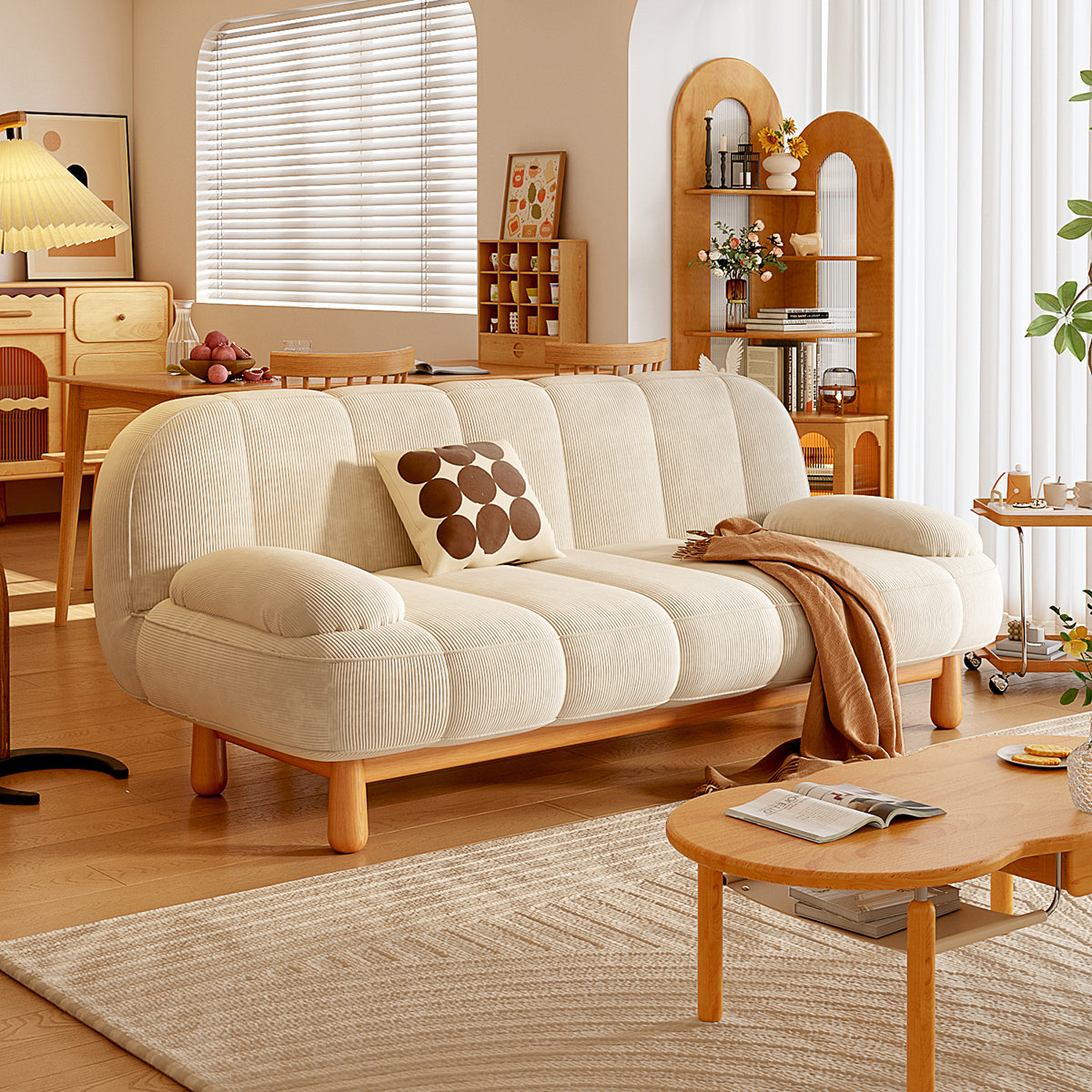 Featuring luxurious corduroy fabric in chic cream white and vibrant avocado green, the sofa bed offers a soft texture and an eye-catching look that fits seamlessly into any decor, from modern minimalist to cozy traditional. It's crafted with a durable ash wood frame and legs that guarantee stability and a long lifespan. The dual-layer cushioning, comprising a 2 cm thick natural latex and 47D high-density foam, provides unmatched comfort and support, whether you're sitting or lying down.