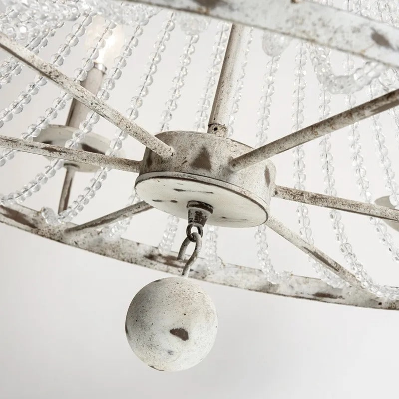 I love the rod iron which appears to be painted then distressed, and the clear beading for that touch of glam. It's perfect for our sunroom/dinning room area. The sun catches the beads and leaves rainbows all over the ceiling. :-) It was a lot of work to put together, and I needed to clear out the small rings that the beaded strands connected to, the instructions were also very limited. It also doesn't come with lights. After many hours of tedious work I had a beautiful chandelier.