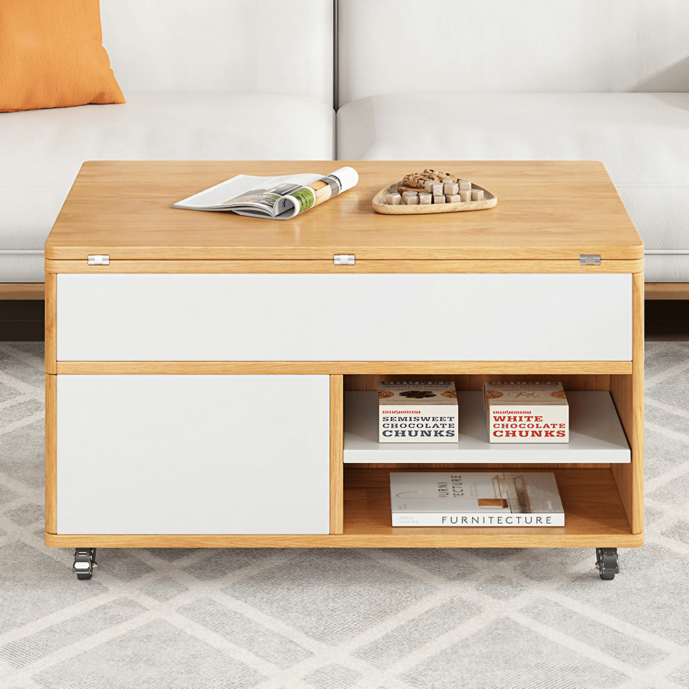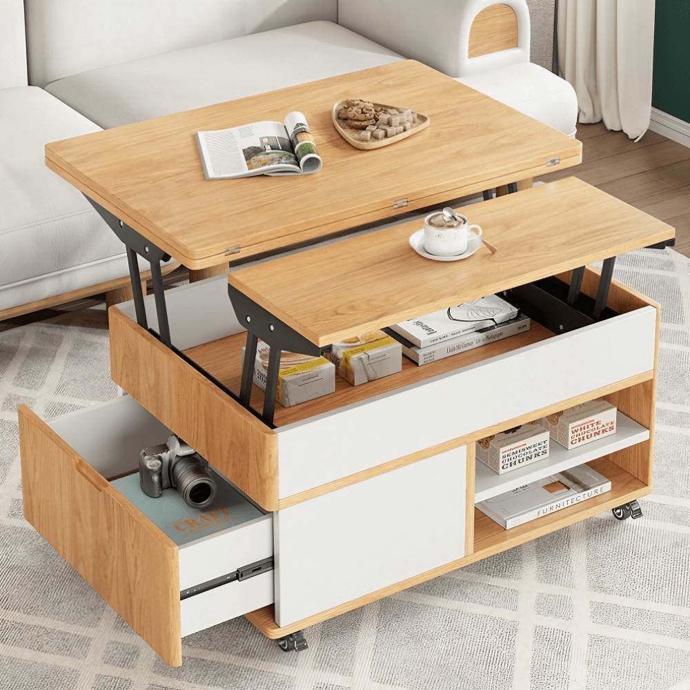 Introducing our Multifunctional Lift-Top Coffee Table, designed to seamlessly integrate into the dynamic lifestyle of the modern home. With its sleek 31-inch rectangle silhouette, this piece is not just a coffee table but a versatile solution to urban living challenges, offering three distinct modes to cater to your every need—Coffee, Office, and Dining.