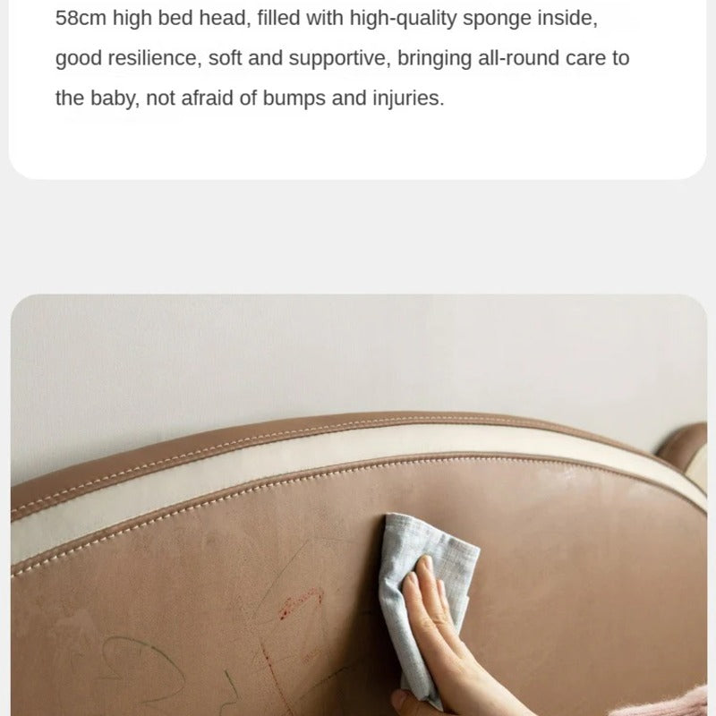 The organic leather fabric is not only gentle on your child's skin but also incredibly practical. Say goodbye to worries about scratches and doodles! This material is easy to wipe clean, antibacterial, and anti-mildew, allowing your child to sleep soundly while making life simpler for parents.