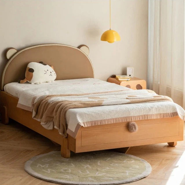 Introducing our delightful beechtree and oak solid wood bear box bed, featuring a charming and skin-friendly organic leather bear soft bag that is available in two options. Designed with both aesthetics and functionality in mind, the bear head is soft and waxy, complemented by thick "bear paws" and a fluffy tail that add a whimsical touch to your child's bedroom.