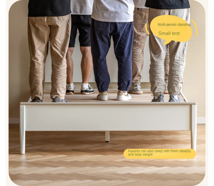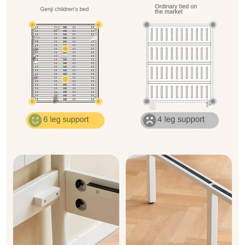 The solid structure emphasizes safety, with a thickened double middle connection system and six-leg support that ensures remarkable stability. A unique crossbar behind the headboard not only reinforces the bed but also eliminates unsightly skirting lines. Furthermore, the corners are carefully rounded and polished, providing a gentle touch for added safety.