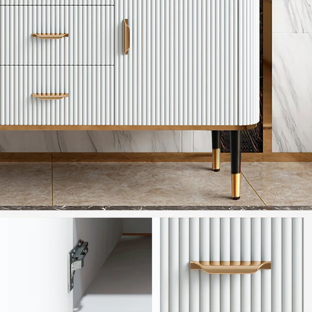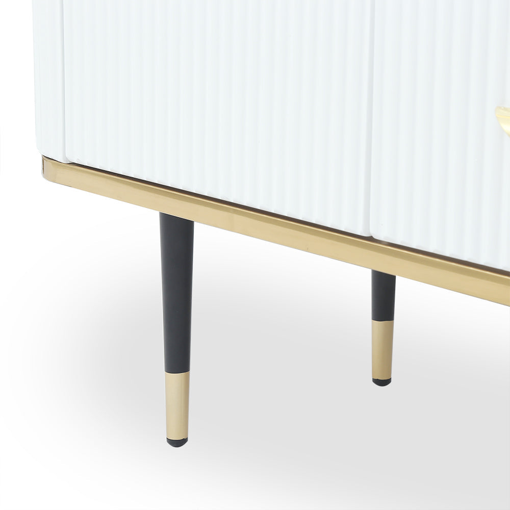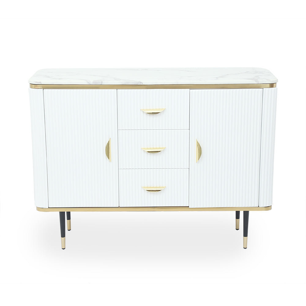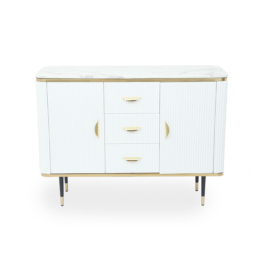 Bring contemporary aesthetic to your space with this essential sideboard. Accented with a delicately textured surface, it lends a glamorous flair that blends well with any modern decor. Featuring a smooth tabletop, it provides a perfect platform for framed photos and collected curios. Doors and drawers round this piece out with handy storage for linens, spare plates, and more. Founded atop four stainless steel feet, it ensures steady support.