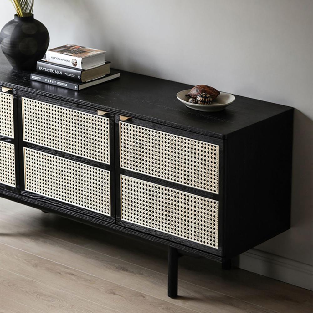 Create a striking piece for the living room or add storage space to the dining room with this contemporary sideboard in rattan. Three doors provide six storage areas which are perfect for cuttinglery napkins, table mats or napkins. The contrast of the black surface and natural doors provide an elegant look to freshen your interior design. Built from top quality pine wood and excellent rattan, it offers solid support and the stability to give your home an elegant appearance and elegance.