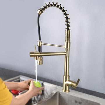Pull Out Double Spout Kitchen Faucet Brushed Gold Double Function Sprayer Solid Brass