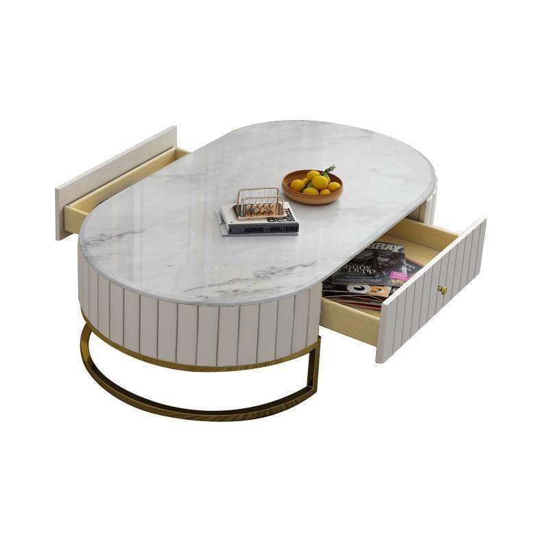 White Oval Storage Coffee Table with Drawers Stone Gold Base - White