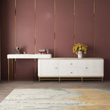 This versatile combo of a makeup vanity table and a cabinet creates a relaxing and comfortable place to makeup while hinting at a sense of elegance and luxury simultaneously. The dressing table can place 90 degrees against the cabinet to fit the corner as your wish or retracted into the right position to match your room size. Two large drawers and two levels of interior shelves of the cabinet provide plenty of space for cosmetic and accessories storage and allows the vanity table to be used as a writing desk. Marble top offers a textured appearance. The base of each leg is sturdy and features a tapered shape to enhance the bearing structure. The seat and Mirror are not included.
