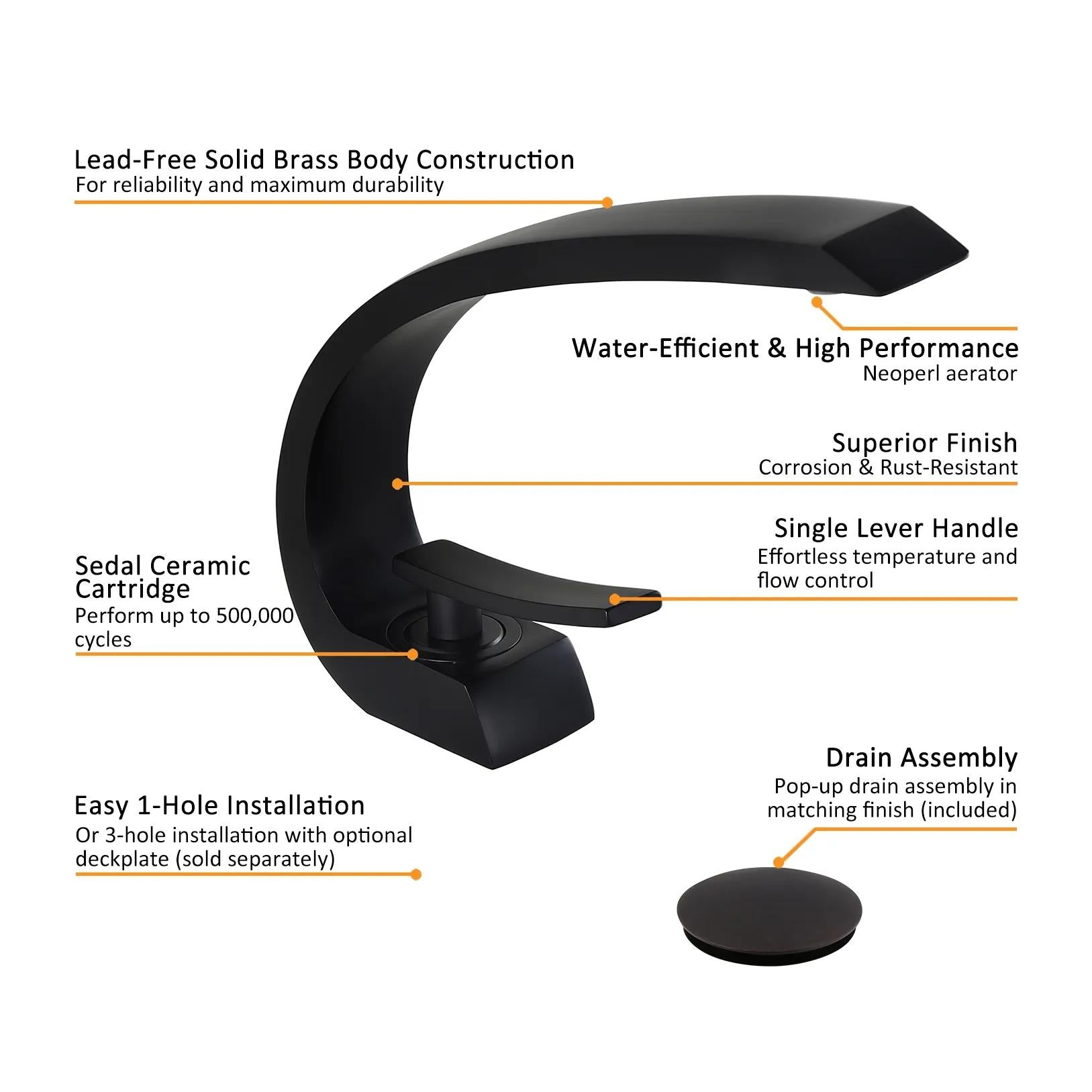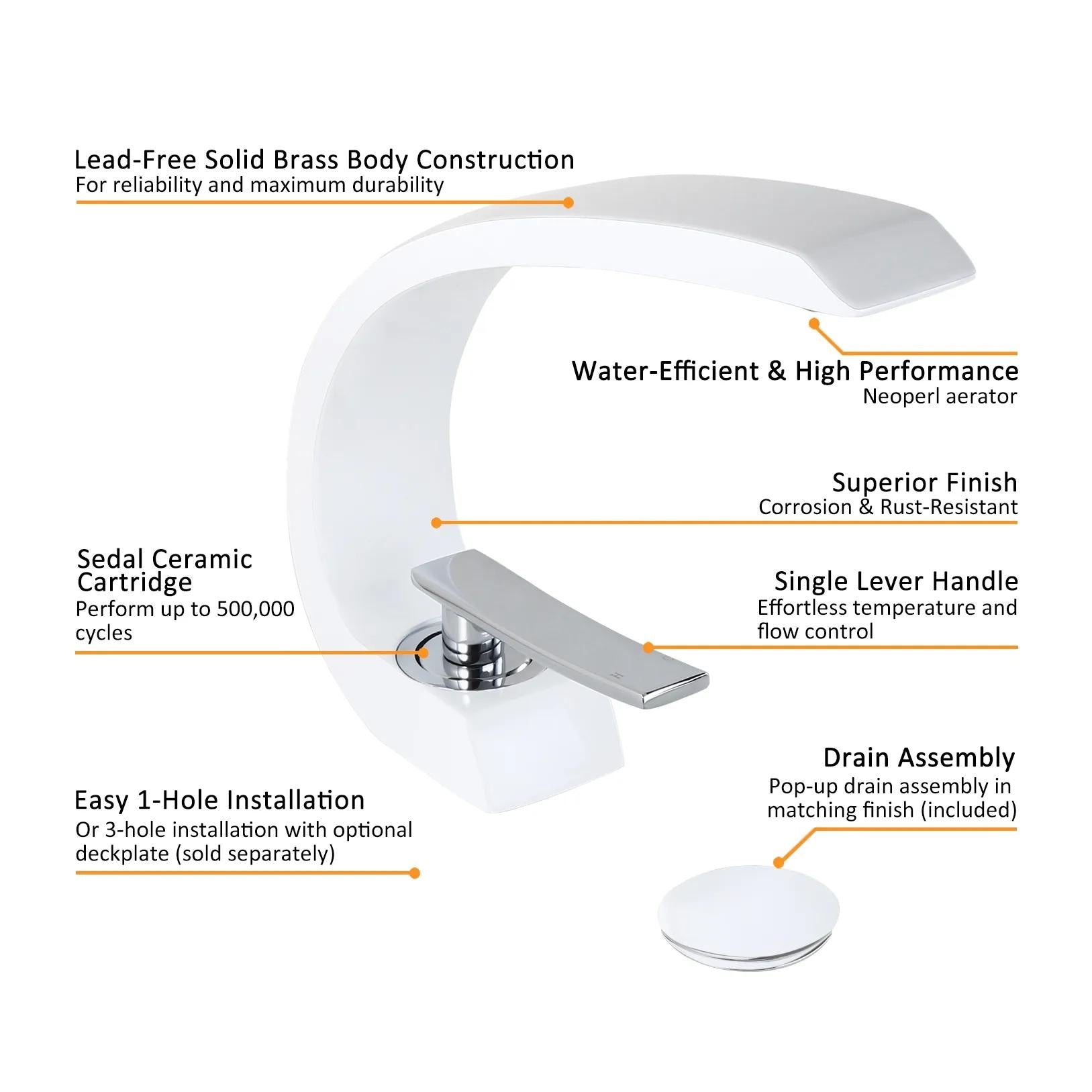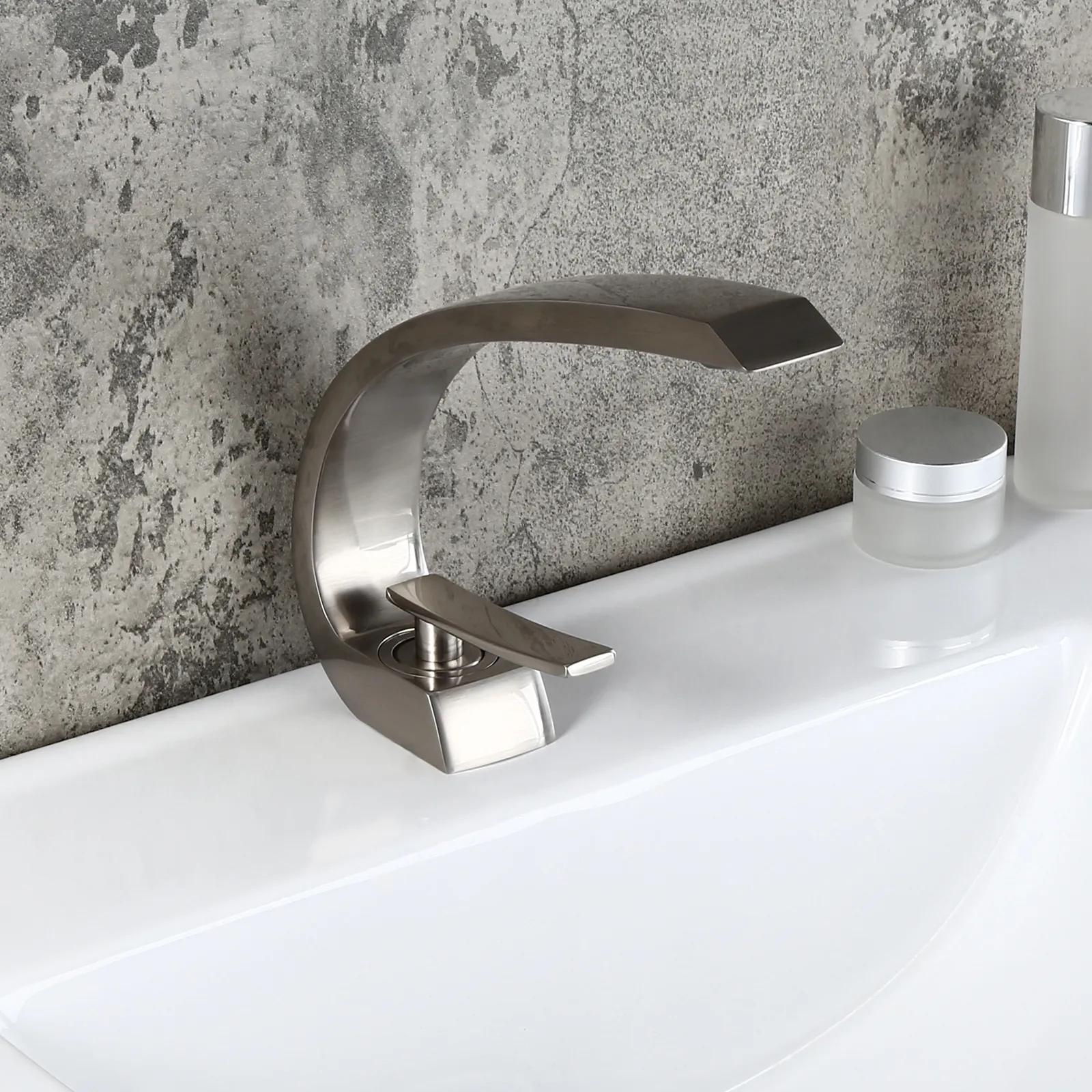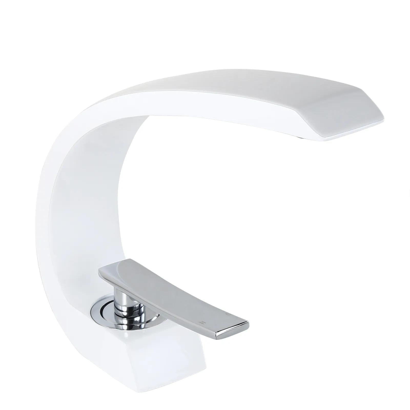 For a touch of artistic appeal and taste, this modern bathroom 1-hole sink faucet is second to none. Boasting a curvaceous arc design with clean lines and smoothly rounded edges, this unique faucet will add a fresh, new look with contemporary appeal to your bathroom. With a flat handle, it offers easy, precise control on hot and cold water flow. Made of solid brass construction and plated in premium finish, it resists corrosion and tarnishing for an everlasting sheen and beauty. A captivating addition that takes your bathroom to the next level.