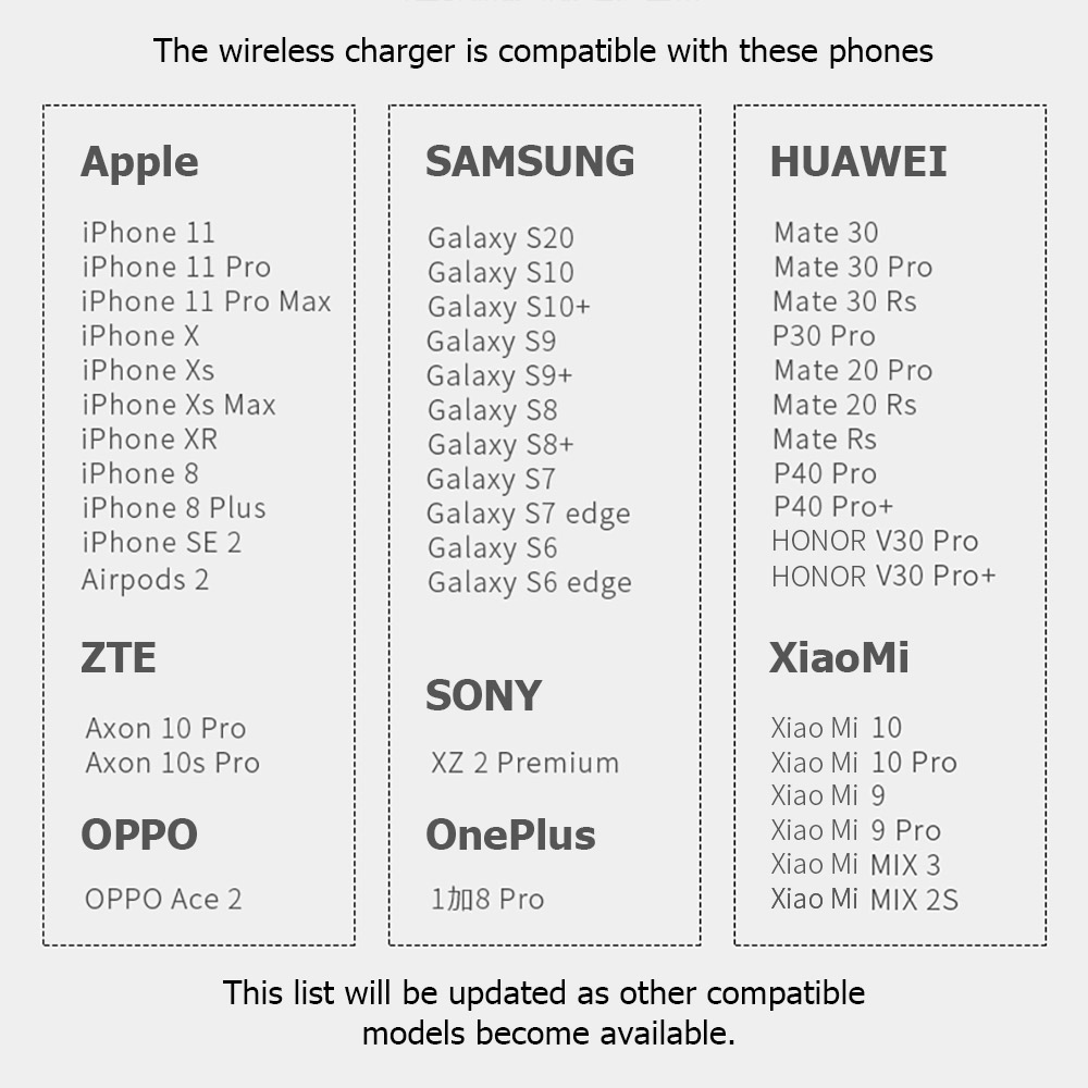 A: Most mobile phones with wireless charging capabilities on the market can use this charger.