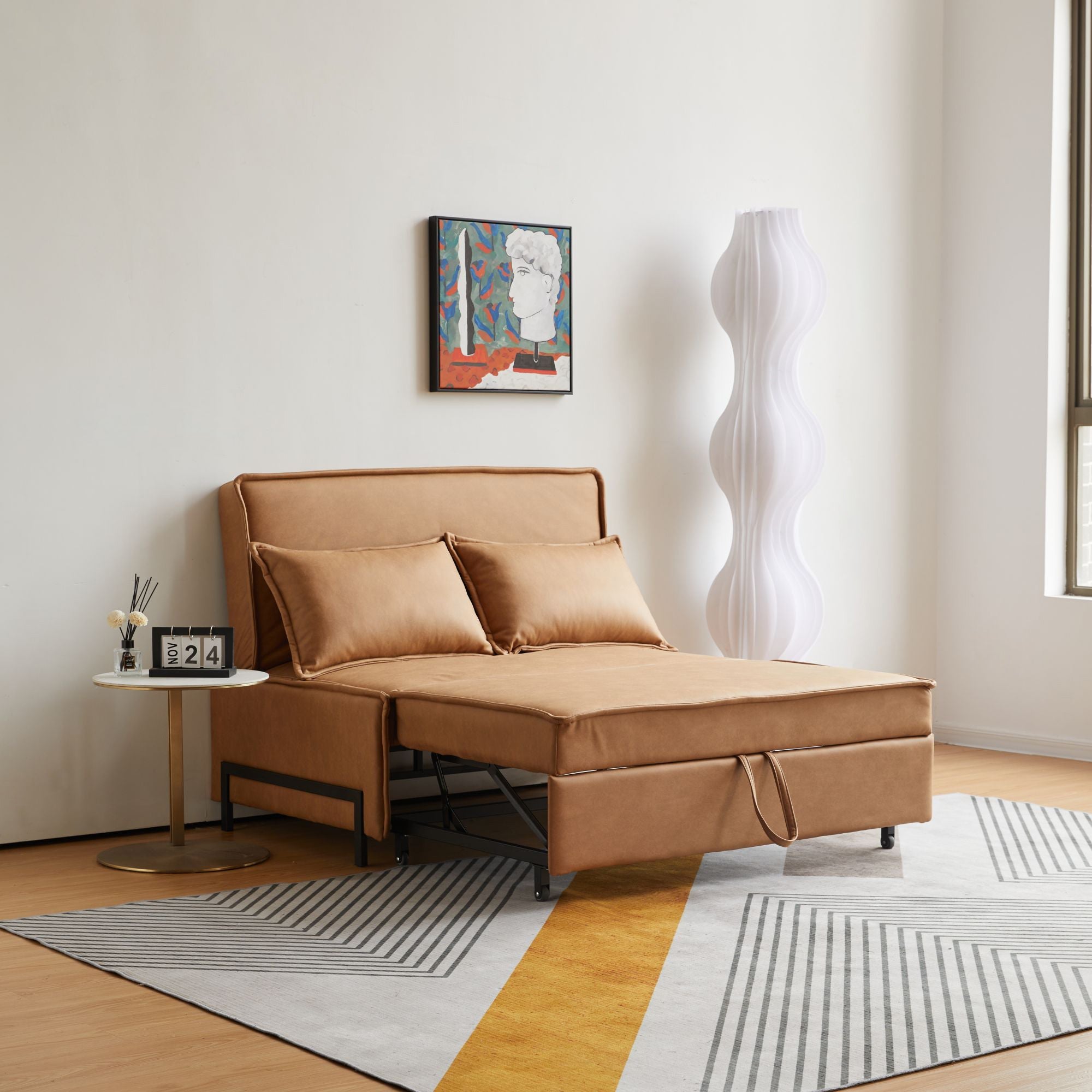 The sofa measures 35.4"W x 33.5"D x 37.8"H and features soft foam fill cushions that promise comfort whether you're sitting or sleeping. The sturdy metal legs ensure stability and add a sleek touch to the overall design. The fabric upholstery is not only stylish in a warm brown hue but also easy to clean, making maintenance a breeze.