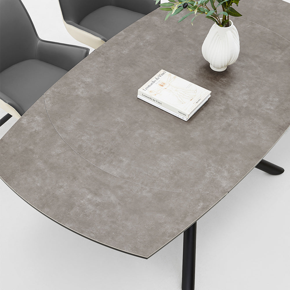 The robust sintered stone tabletop, renowned for its durability and ease of maintenance, promises a long-lasting surface that resists wear and tear. Its subtle grey hue elegantly complements any dining room decor, while the table's black carbon steel base provides a sturdy foundation with a sleek, minimalist aesthetic.