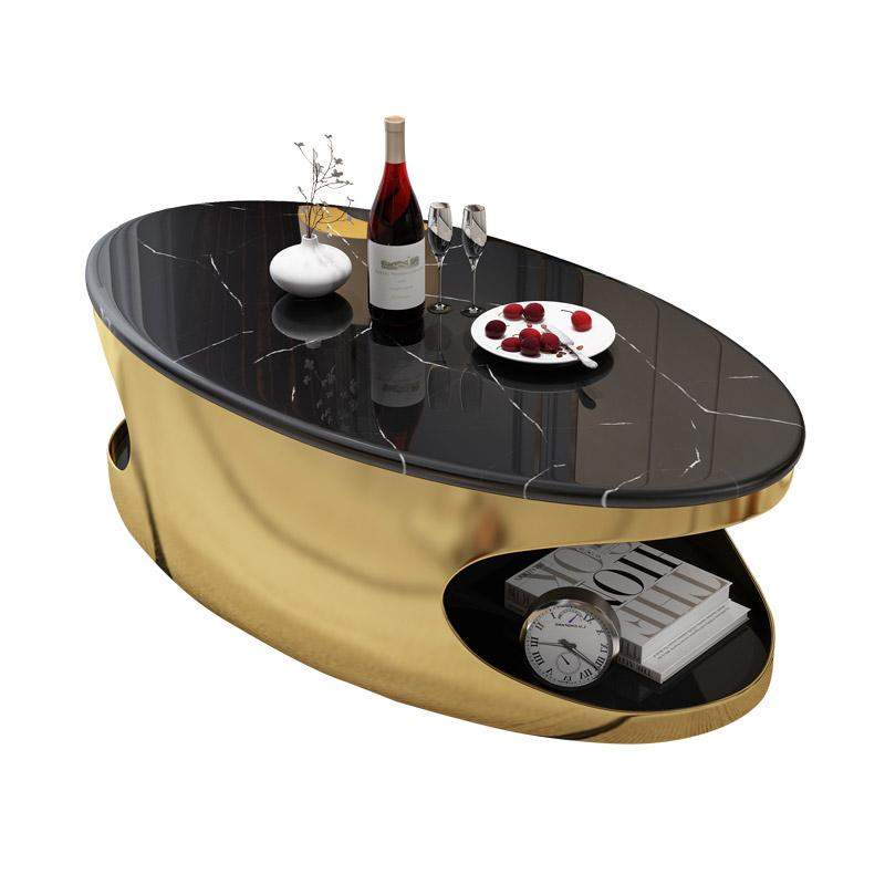 Mesa de centro ovalada negra de imitación de mármol dorado con mesa decorativa moderna de acero inoxidable con almacenamiento