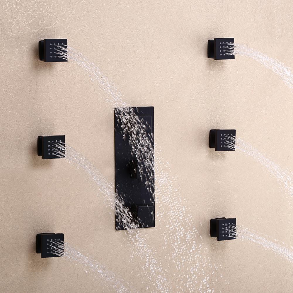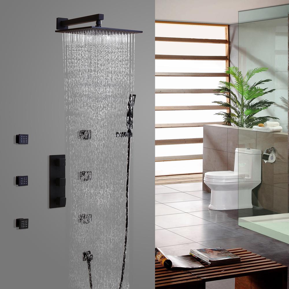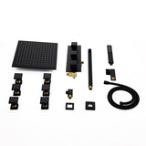 - Incluye cabezal de ducha de lluvia de 12" (300 mm), brazo de ducha de montaje en pared, 6 rociadores para el cuerpo, piezas de ducha de mano y válvula de ducha de 3 funciones.