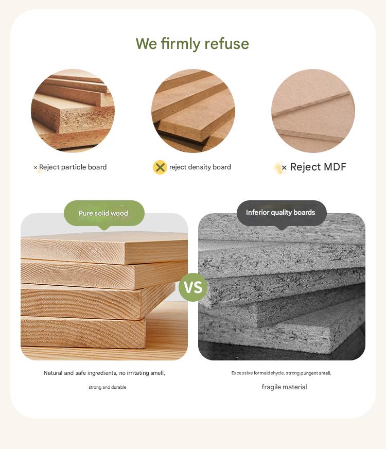 Nuestro compromiso con la seguridad y la sostenibilidad se refleja en el uso de pintura inodora y ecológica, aplicada como imprimación para mejorar la impermeabilidad, resistencia al aceite y estabilidad general. Protegida adicionalmente con una mezcla de aceite vegetal y cera, el acabado no solo es natural, sino que también proporciona un aspecto cálido y pulido, priorizando la seguridad de tu familia.