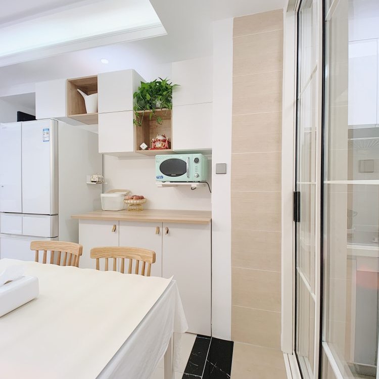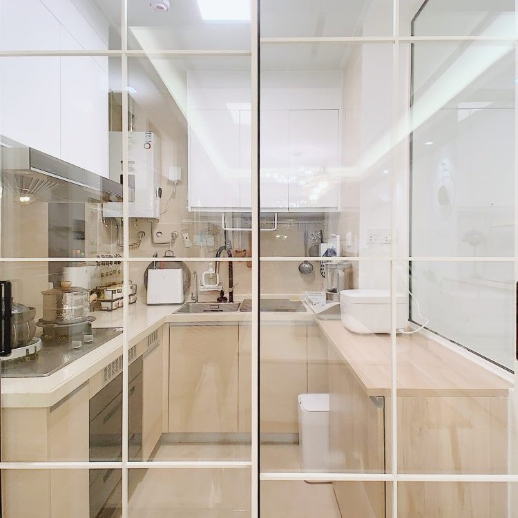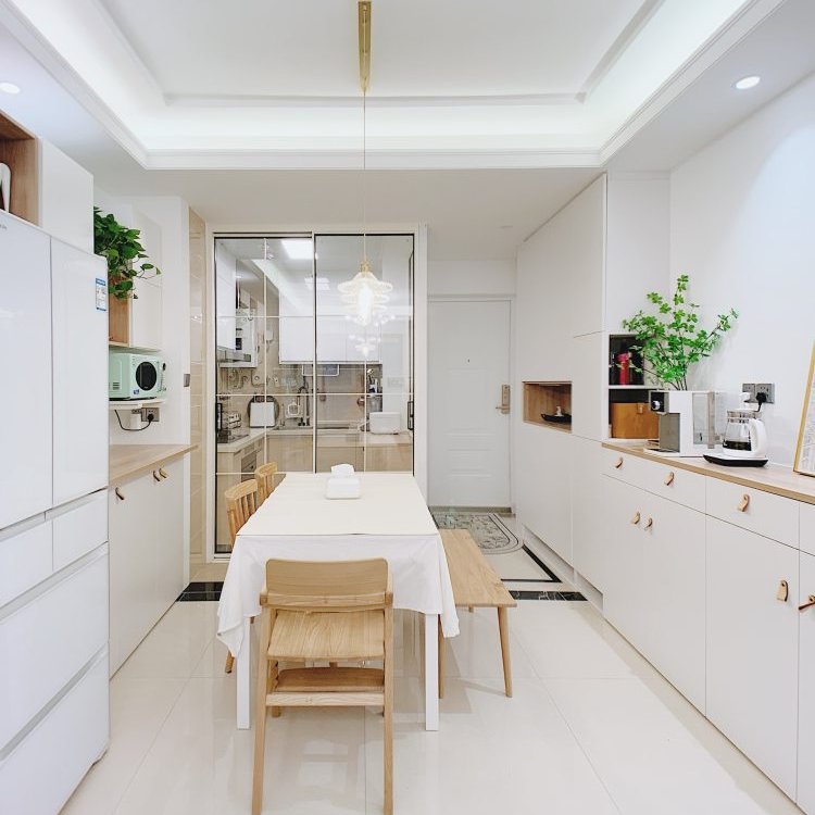 Le premier changement majeur a été de démolir deux murs de la cuisine. Cela a immédiatement amélioré la relation entre la salle à manger et la cuisine, améliorant à la fois la lumière et le flux d'air. J'ai déplacé le réfrigérateur dans la salle à manger, l'intégrant avec une armoire à buffet réservée à cet effet. De plus, j'ai étendu le comptoir de l'armoire, transformant la forme L en une forme en U plus fonctionnelle. Pour rendre la salle à manger plus spacieuse, j'ai sacrifié une partie de l'espace inefficace de la cuisine. L'installation de portes et de partitions coulissantes en verre dans la cuisine a non seulement fourni une sensation ouverte, mais a également aidé à contenir des fumées de cuisine.