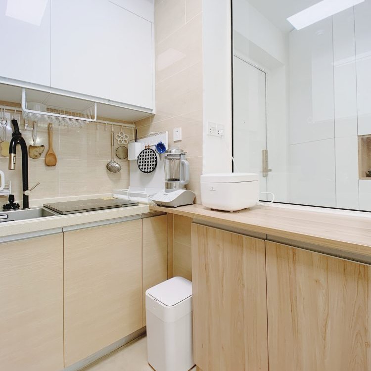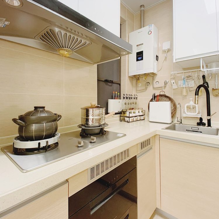 L'appartement est livré avec des appareils standard: une hotte, un poêle et une armoire de désinfection. J'ai trouvé que le placer de l'armoire de désinfection sous le poêle était une solution économe en espace. Le poêle, équipé de doubles brûleurs, est adéquat pour une famille de 3-5. Je dois recommander un ajout récent à ma cuisine - une casserole de haute qualité de Songbanwu, qui se réchauffe plus rapidement que les casseroles régulières et a une grande capacité malgré sa taille compacte. Leur pot en terre d'herbe en pierre noire est non seulement fonctionnel pour les soupes et les ragoûts, mais aussi esthétiquement agréable dans la cuisine.